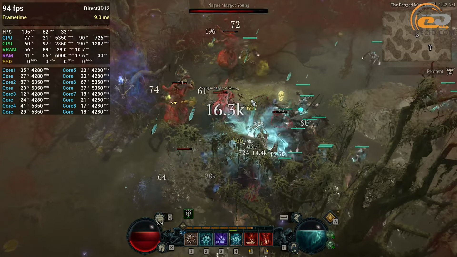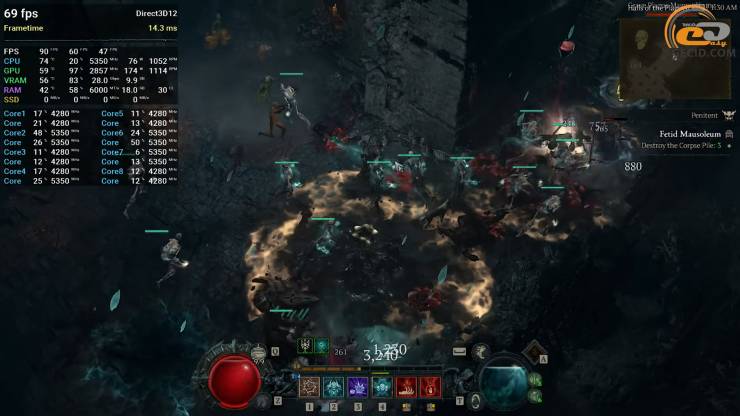 Испытуемая система предоставляет почти достаточно ресурсов для преодоления Diablo IV на RT Ultra пресете графики. В первые минуты игры могут случаться незначительные проблемы с плавностью — движок постепенно кэширует данные и привыкает к локации. Дальше геймплей становится более стабильным и все ощущается вполне комфортно, но преимущественно днем: в светлых зонах нагрузка ниже, и это хорошо заметно.