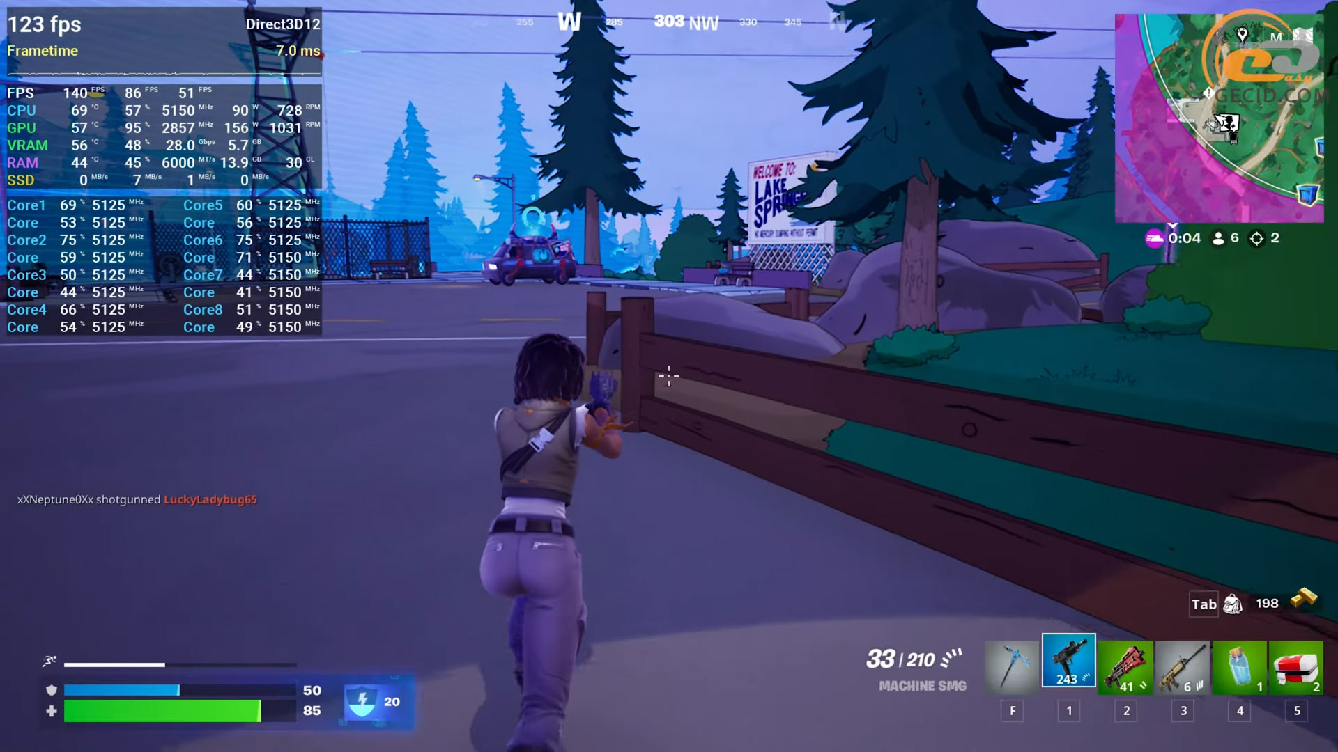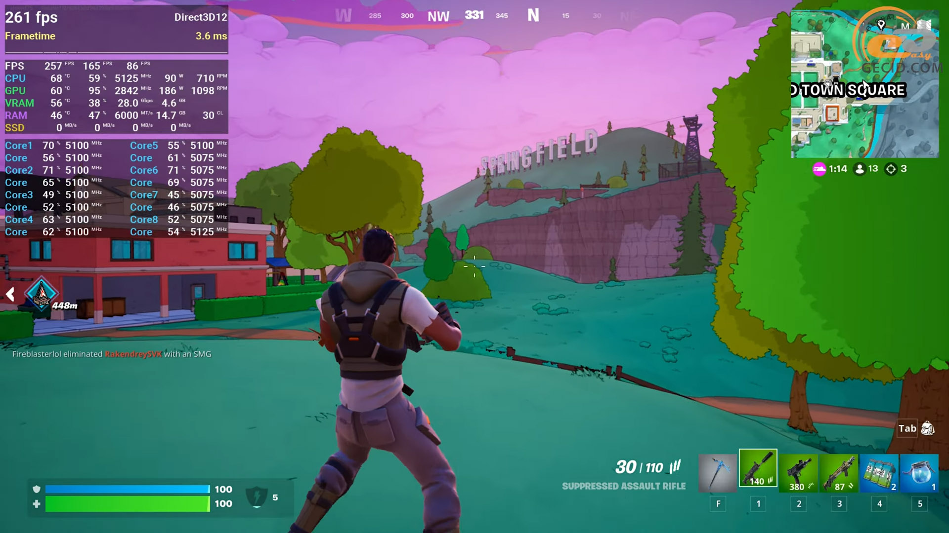С апдейтом в стилистике «Симпсонов» Fortnite сейчас выглядела довольно легкой задачей для видеокарты, но трассировка лучей все еще делает свое. На максимальных настройках с включенным аппаратным RT система выдает в среднем 140 FPS, а показатель очень редких событий указывает на просадки в районе 56 обновлений экрана в секунду. То есть геймплей в целом плавный, но иногда рывки все же возможны, особенно когда движок активно подгружает геометрию или эффекты.