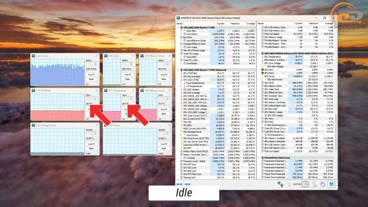 Начнём с прогрева. Без существенной нагрузки на ПК все тихо и спокойно – температуры CPU и GPU в норме – около 36 градусов Цельсия соответственно на обоих.