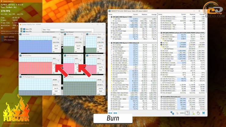 При стрессовом нагрузке в FurMark процессор и видеокарта разогреваются до температур в 72 и 65 градусов соответственно. При этом частоты графического процессора колеблются около 2350 МГц.