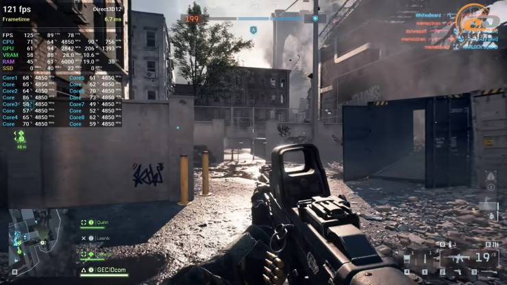 Battlefield 6 на пресете Overkill сначала чувствует себя замечательно: игра идет плавно, средняя частота кадров держится около 120, и система вытягивает даже самые горячие моменты масштабных столкновений. Но через некоторое время начинают появляться легкие подтупы, и причина здесь достаточно очевидная — видеопамяти слишком много не бывает. Индикация в меню краснеет, показывая более 13 ГБ использованной VRAM, тогда как RTX 5070 имеет всего 12, и это время от времени дает о себе знать. Чтобы избавиться от подобных моментов, достаточно или снизить настройки до ультрауровня или включить DLSS в режиме Quality. Оба варианта не портят картинку, но заметно стабилизируют геймплей.