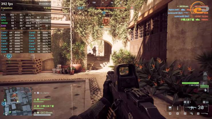 В Call of Duty можно себе ни в чем не отказывать — при работе на экстремальных настройках средняя частота смены кадров составляет 162, а в перестрелках или активных перебежках FPS не падает ниже уровня в 150 обновлений, что также является более чем достаточным результатом для комфортного игрового опыта. Так что производительность системы не помешает занять первое место — все будет зависеть только от собственных действий.