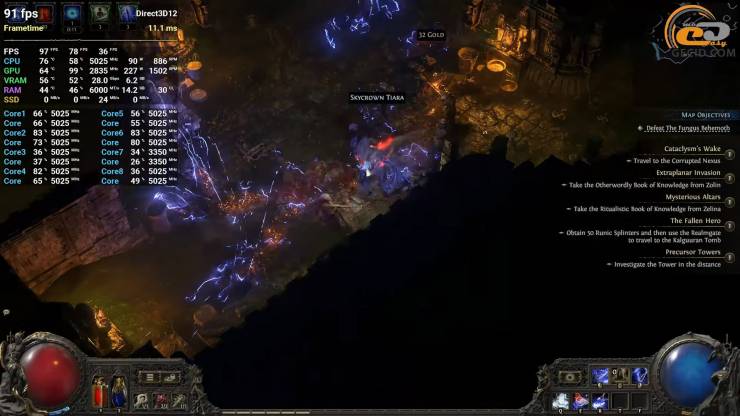 Побегать в активной Path of Exile 2 можно без проблем – игра прекрасно держится на высоких настройках с ультра качественными тенями и глобальным освещением. Приятно, что даже во время множества эффектов на экране частота кадров остается на комфортном уровне. Хотя на этот раз карта была не самая тяжелая – как в плане визуальной нагрузки, так и по количеству монстров – система все равно демонстрирует себя с очень хорошей стороны, поэтому и в тяжелых сценариях все будет ОК.