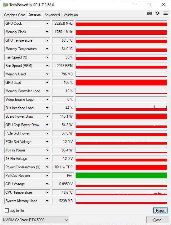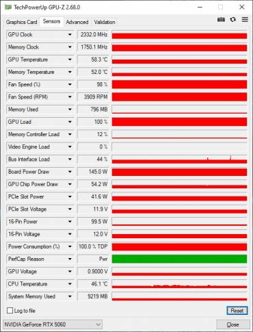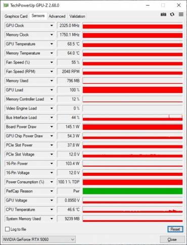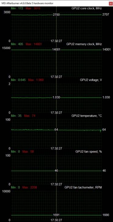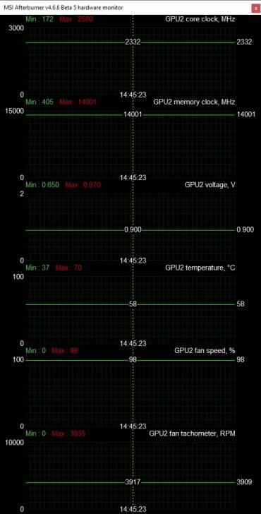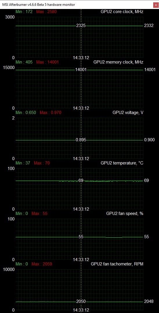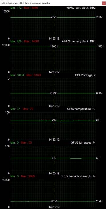 Переходим к практике. При автоматической регулировке скорости вращения лопастей и максимальной нагрузке, графическое ядро нагрелось до 69°С, а память – до 64°С. Скорость пропеллеров стабилизировалась при 2050 об/мин, что сопровождалось комфортным средним шумом. Частота GPU зафиксировалась на показателе 2325 МГц, что на 215 МГц ниже динамической.