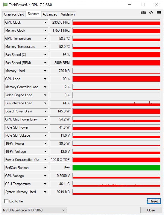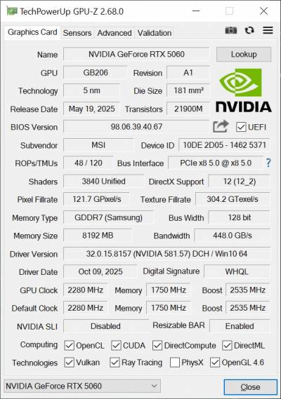 Утилита GPU-Z сообщает об использовании в основе видеокарты 5-нм графического процессора NVIDIA GB206-250-A1 с микроархитектурой NVIDIA Blackwell и 3840 CUDA-ядрами. Базовая его частота соответствует эталонным 2280 МГц. В свою очередь заводской разгон обеспечивает прирост динамической частоты с эталонных 2497 МГц до 2535 МГц (+1,5%) в режиме «Boost» и до 2550 МГц (+2,1%) в «Extreme Performance», доступном в ПО MSI Center.