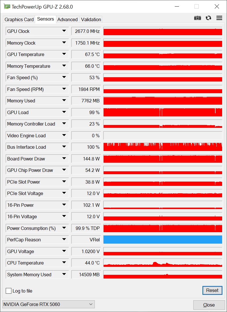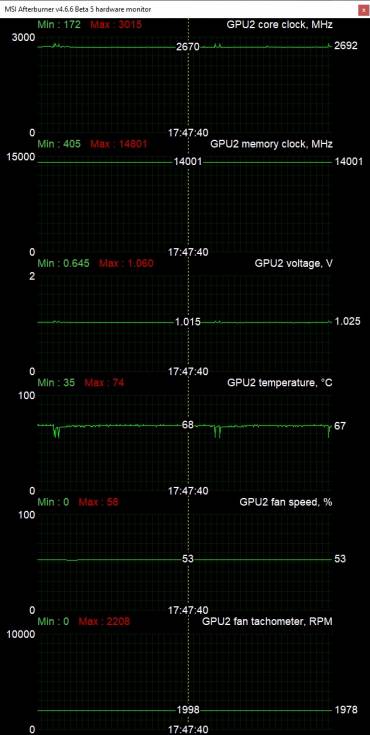 При переходе в разрешение 4K Ultra HD частота графического чипа опустилась до 2677 МГц, его температура выросла до 68°С, а нагрев памяти – до 66°С. В свою очередь скорость вентиляторов немного не дотягивает до 2000 об/мин, создавая средний шумовой фон.