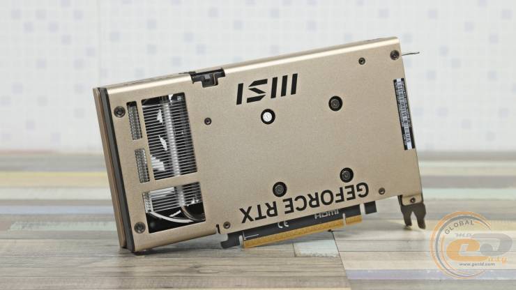 На боковой грани находится надпись «GeForce RTX» и логотип производителя – именно этот ракурс владелец чаще всего будет наблюдать сквозь прозрачную боковую панель корпуса. Бронзовый бэкплейт с плавными изгибами гармонично дополняет общий дизайн, придавая ему изящности.