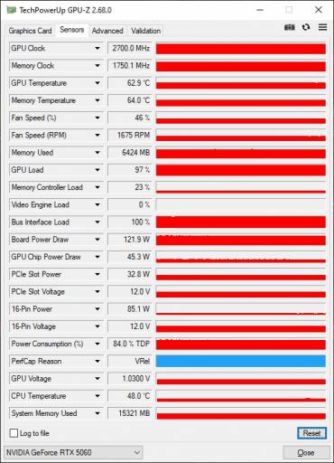 И теперь к самому интересному – работе СО в играх. В Cyberpunk 2077 при разрешении Full HD и пресете Ultra частота GPU поднялась до 2700 МГц, что на 150 МГц выше динамической. При этом его температура держалась около 63°С, а пропеллеры достаточно тихо работали на 46% от максимальной скорости – 1675 об/мин.
