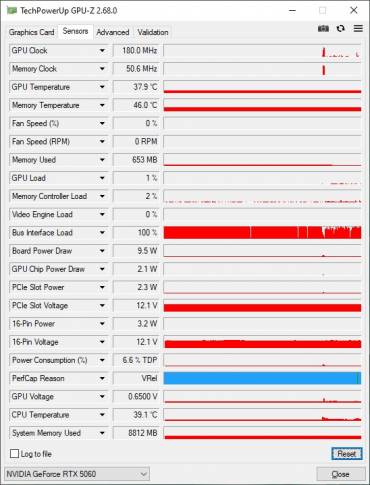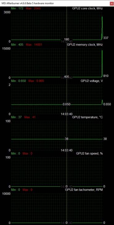 А вот при отсутствии нагрузки система охлаждения переходит в бесшумный режим работы. Температура графического процессора стабилизировалась на 38°С, памяти – на 46°С. В то же время в помещении, где проходили тесты, было +18°С.
