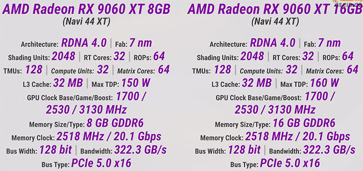 И сначала немного напомним об Radeon RX 9060 XT. Это представительница нового поколения AMD на архитектуре RDNA 4, которая получила все ключевые черты линейки: улучшенные RT-ускорители, отдельные блоки для AI-вычислений, полную совместимость с FSR 4 и т.д. За основу здесь взят чип Navi 44 в его младшей конфигурации: 32 вычислительных блока, а это 2048 потоковых процессоров, 32 RT-ядра и 64 AI-акселератора. Рабочие частоты также достаточно приличные — в Boost режиме GPU способен разгоняться до 3100 МГц, что для среднего сегмента выглядит более чем убедительно. Также современной остается и поддержка интерфейсов — все модели на RX 9060 XT оснащаются DisplayPort 2.1a и HDMI 2.1b, то есть проблем с высокочастотными мониторами не будет. А заявленный TDP ограничен на отметке 150 Вт для младшей модификации и 160 – для старшей.