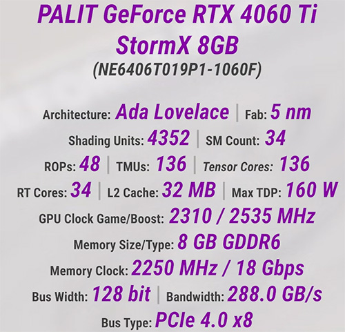 В нем: 4352 CUDA-ядра, 136 текстурных блоков и столько же тензорных ядер, 48 блоков растеризации и 34 ядра, отвечающих за ускорение трассировки лучей. Базово GPU работает на частоте 2310 МГц и способен разгоняться до 2540 МГц. Памяти здесь также 8 ГБ, но старого формата GDDR6 с довольно ограниченной 128-битной шиной, обеспечивающей всего 288 ГБ/с пропускной способности. При этом TDP немного выше – 160 Вт.