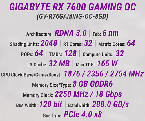Здесь используется чип Navi 33 с 2048 потоковыми процессорами, 64 блоками растеризации и 128 текстурными модулями, а также 32 RT-акселераторами. Рабочие частоты ускорены до 1876 МГц при базовой работе, а во время буста уже могут достигать и 2760 МГц. Памяти разработчики предоставили также 8 ГБ типа GDDR6 с привычной 128-битной шиной. Так что пропускная способность составляет 288 ГБ/с. При этом ускоритель имеет еще и энергопотребление в 165 Вт.