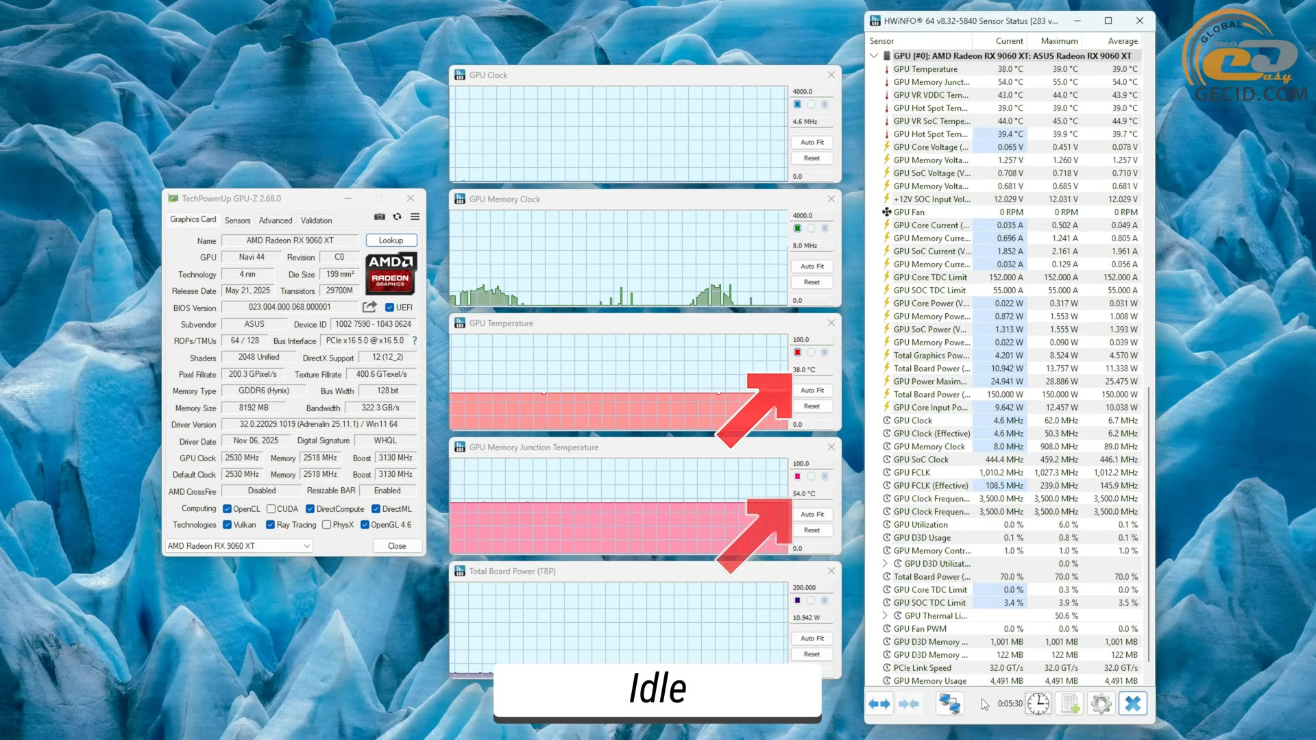 Без какой-либо нагрузки GPU греется на 39 градусов, а VRAM уже на 54, рабочие же частоты находятся на минимальном уровне.
