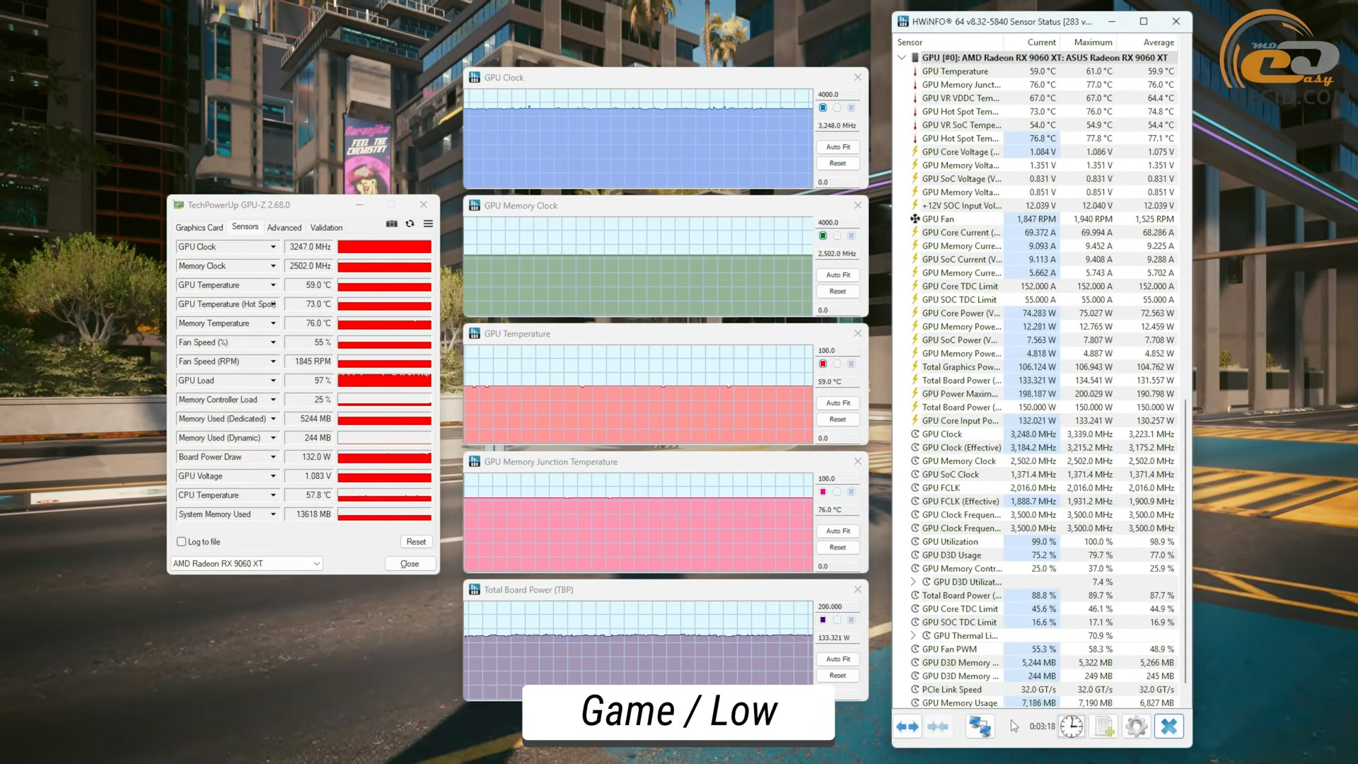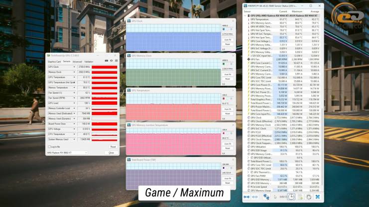 На примере игры в Cyberpunk 2077 на «максималках» температурные показатели находятся примерно на том же уровне, тогда как частота GPU доходит почти до 2800 МГц.