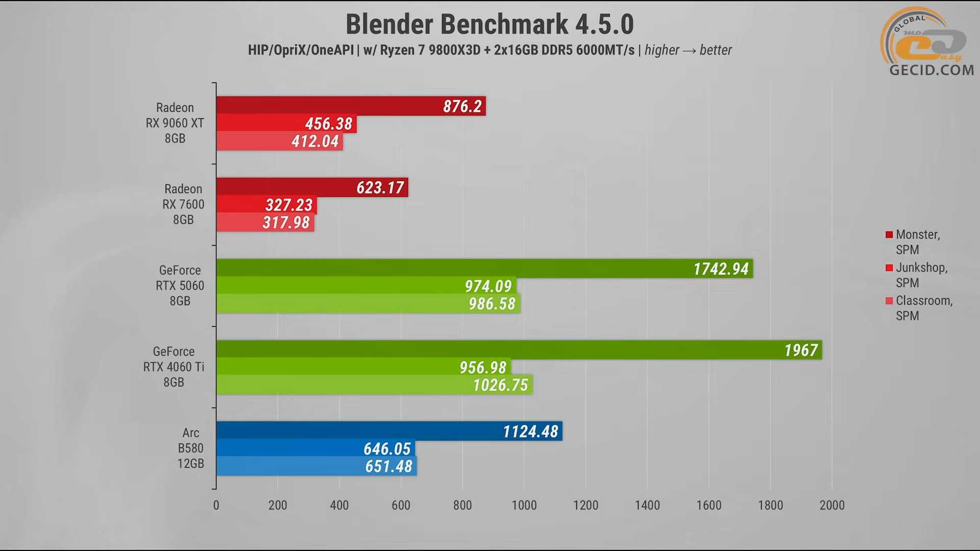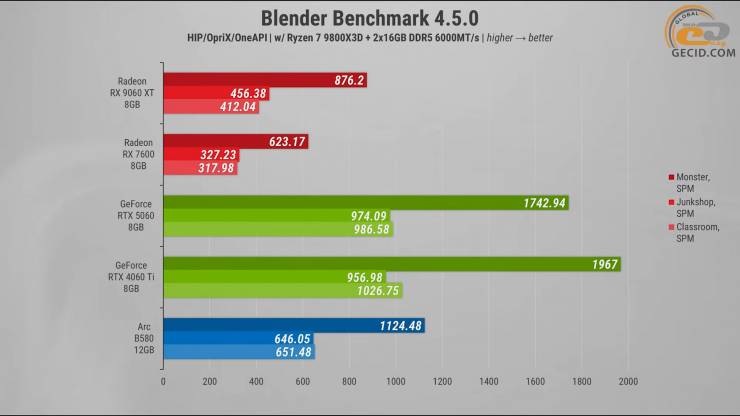 В Blender результат получился достаточно ожидаемым: Radeon RX 9060 XT хоть и опережает RX 7600 примерно на 35 процентов, но против конкурентов, работающих на CUDA-ядрах, выглядит существенно слабее. RTX 5060 показывает примерно на 50 процентов лучший результат, а RTX 4060 Ti отрывается еще сильнее – в среднем на 55 процентов. Даже представитель Intel имеет комфортное преимущество на уровне 30 процентов.
