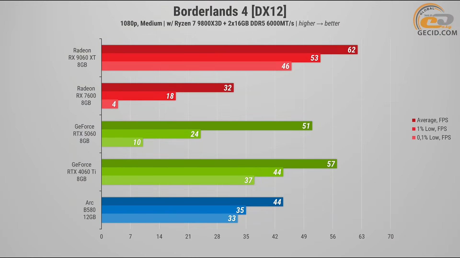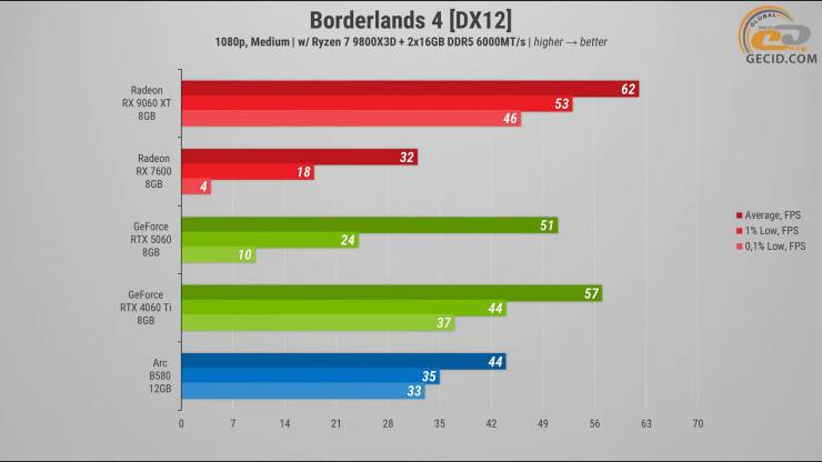 В Borderlands 4 во время перебежки довольно «зеленой» локацией на средних настройках Radeon RX 9060 XT снова подтвердила свое преимущество над другими картами, но не с такой уверенностью. Она опережает RTX 4060 Ti всего на 9 процентов, а от RTX 5060 отрывается уже более уверенно – примерно на 22 процента.