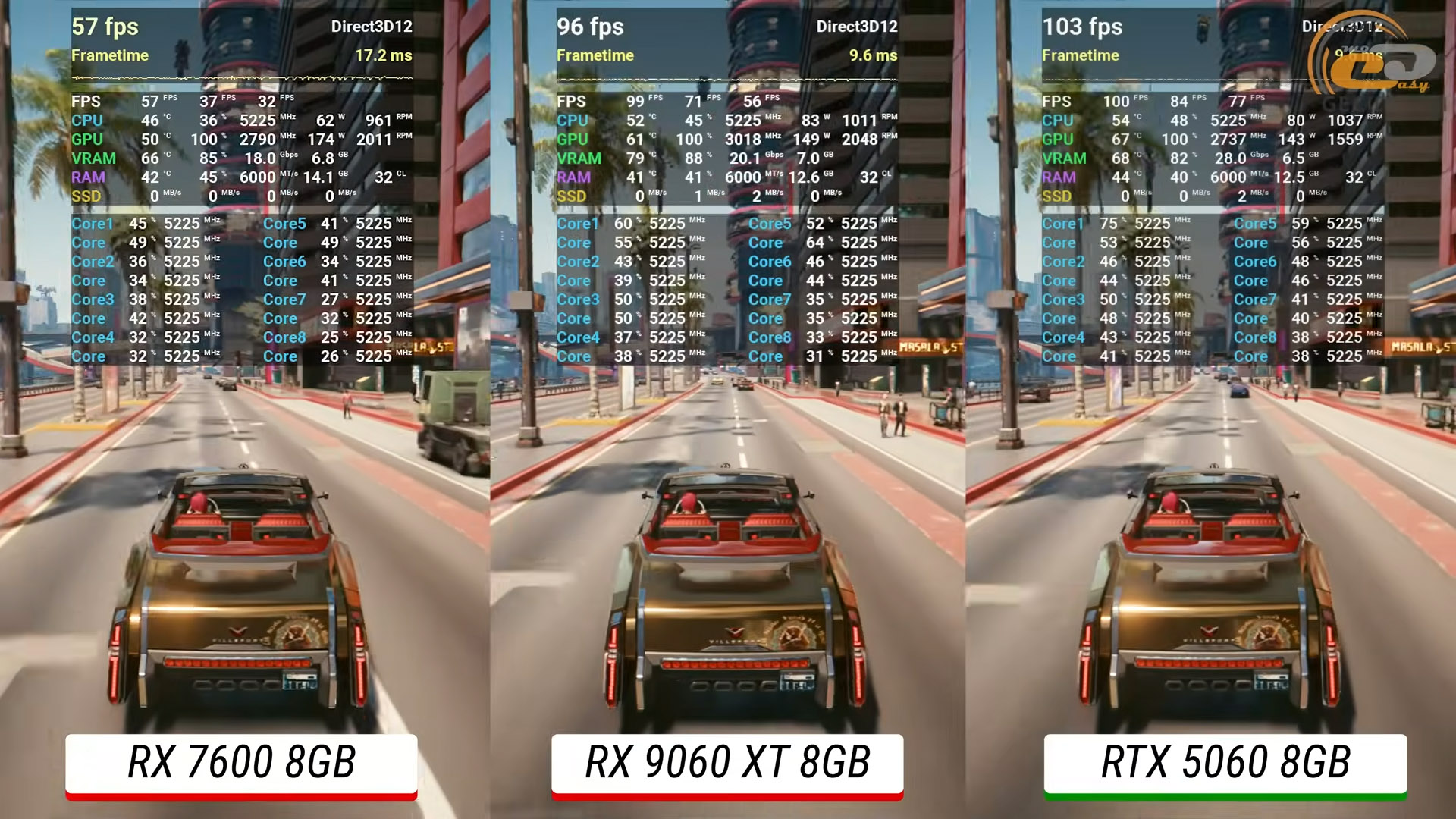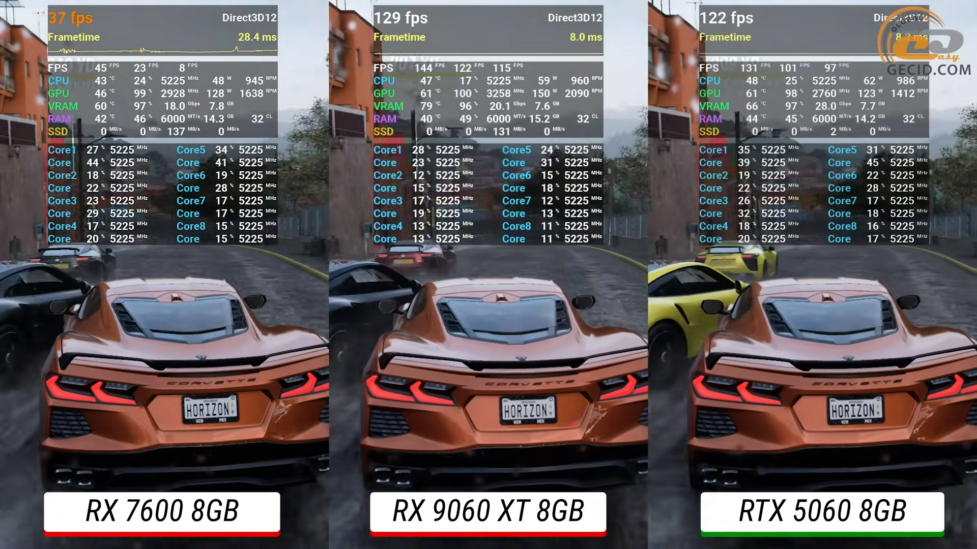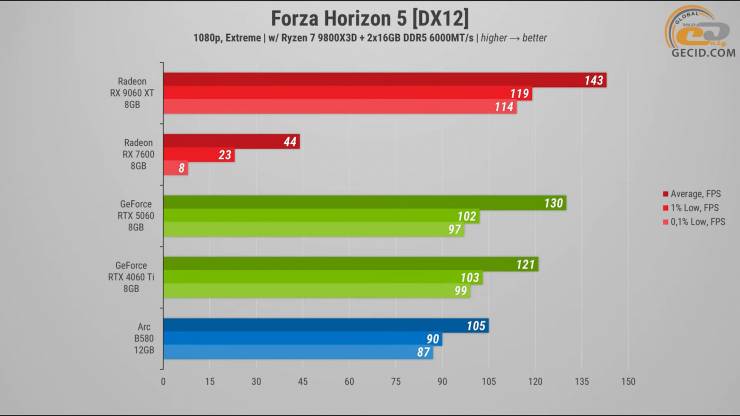 В Forza Horizon 5 на экстремальных настройках Radeon RX 9060 XT снова демонстрирует очень уверенное лидерство. Она обходит RTX 5060 примерно на 10 процентов, обеспечивая несколько более высокий средний FPS и лучшую стабильность кадра. А над RTX 4060 Ti преимущество уже более заметно — в пределах 18 процентов.