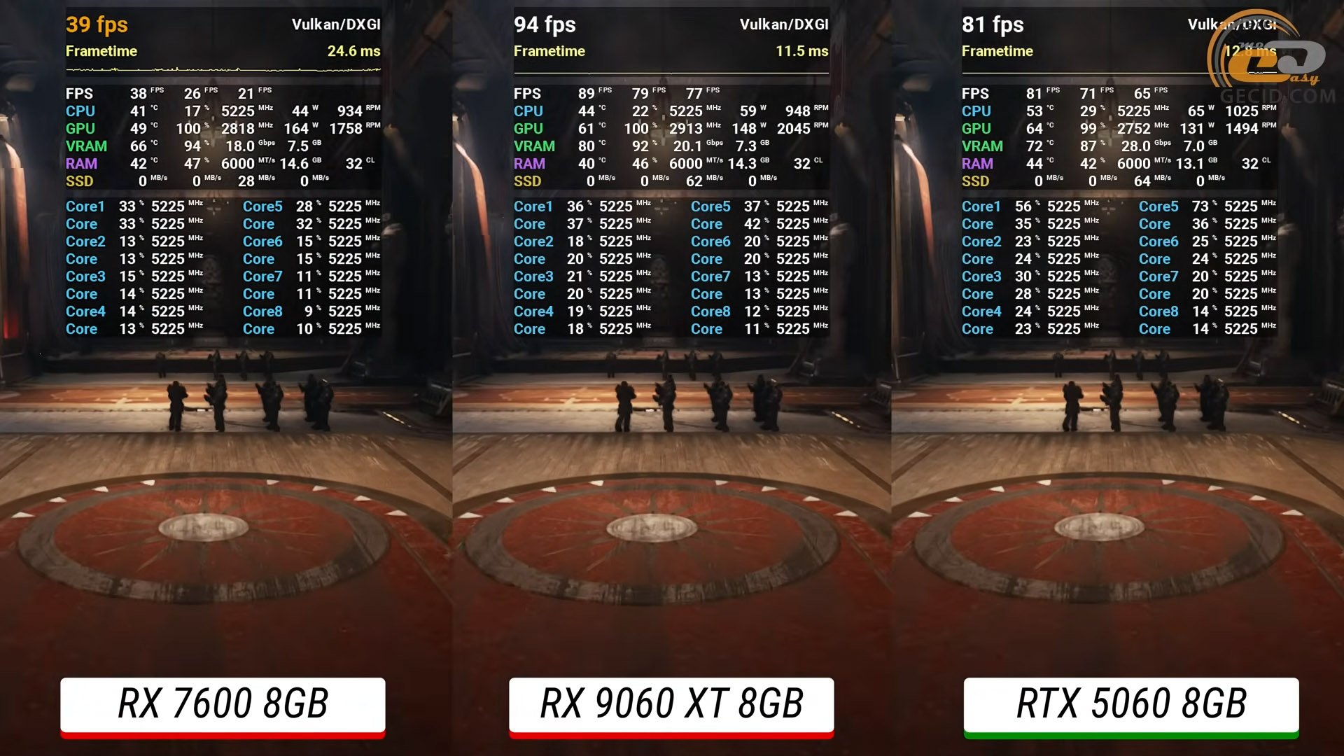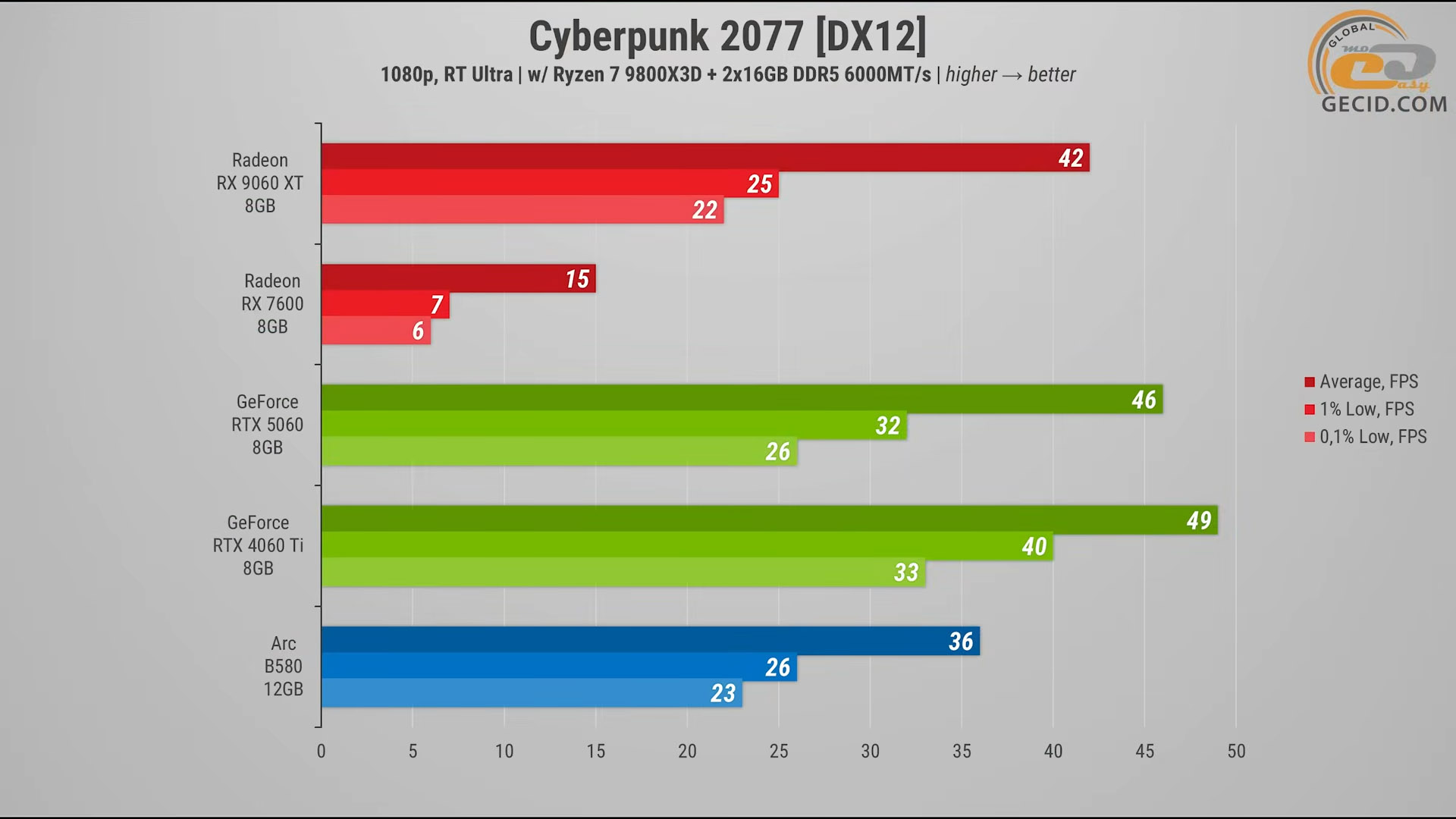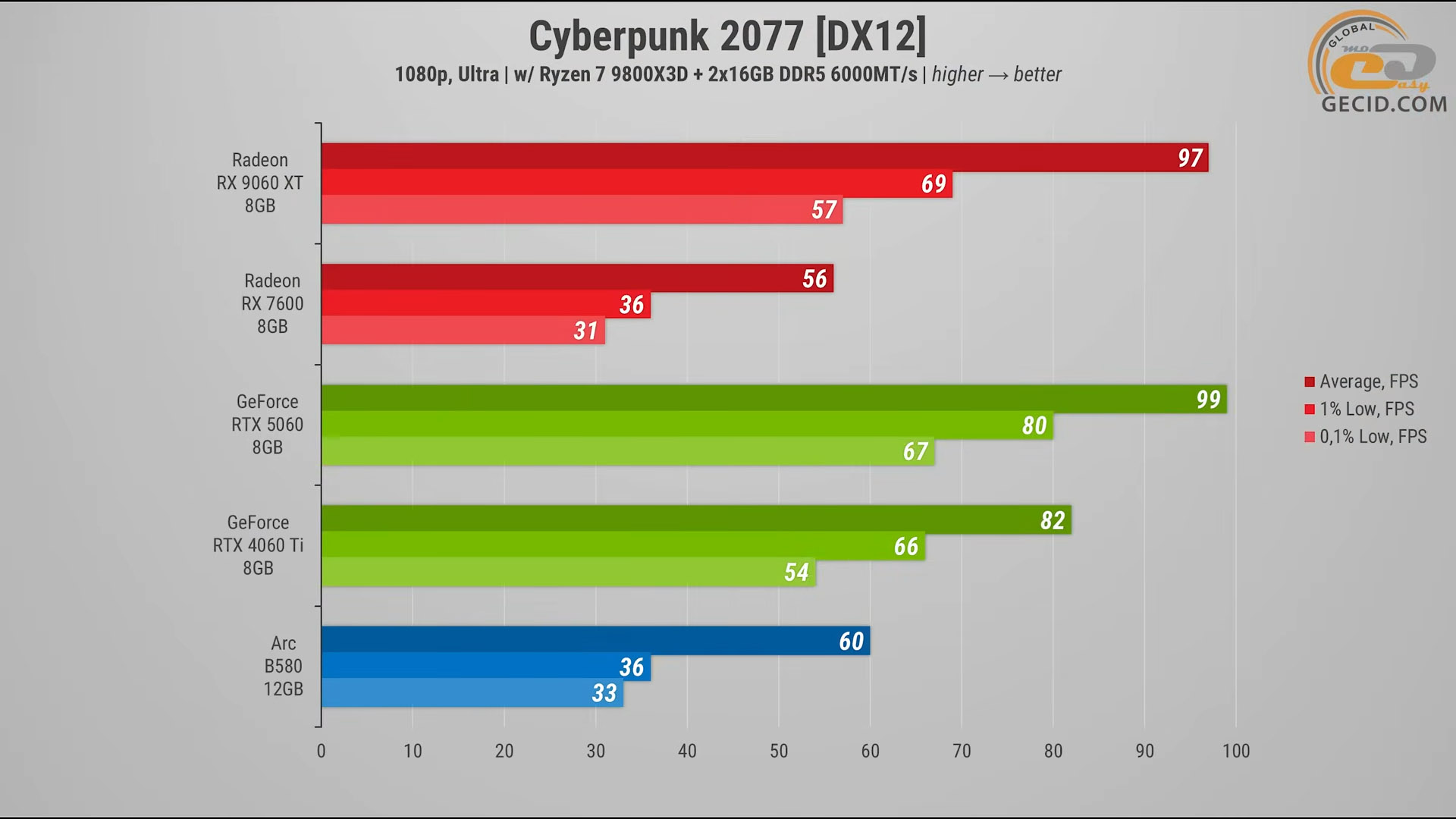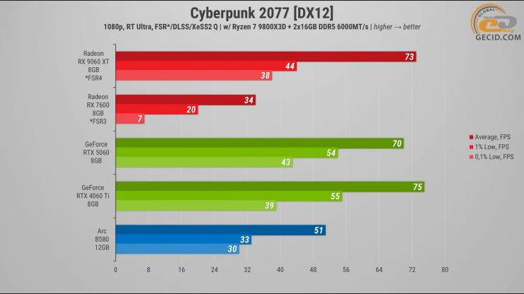 Героиня же тестов, в свою очередь, идет на уровне RTX 4060 Ti и RTX 5060 — разница находится в пределах 2–3 процентов, что в реальном геймплее не ощущается. Что касается Arc B580, то она показывает чуть хуже результат и уступает новинке от AMD на 18 процентов производительности.