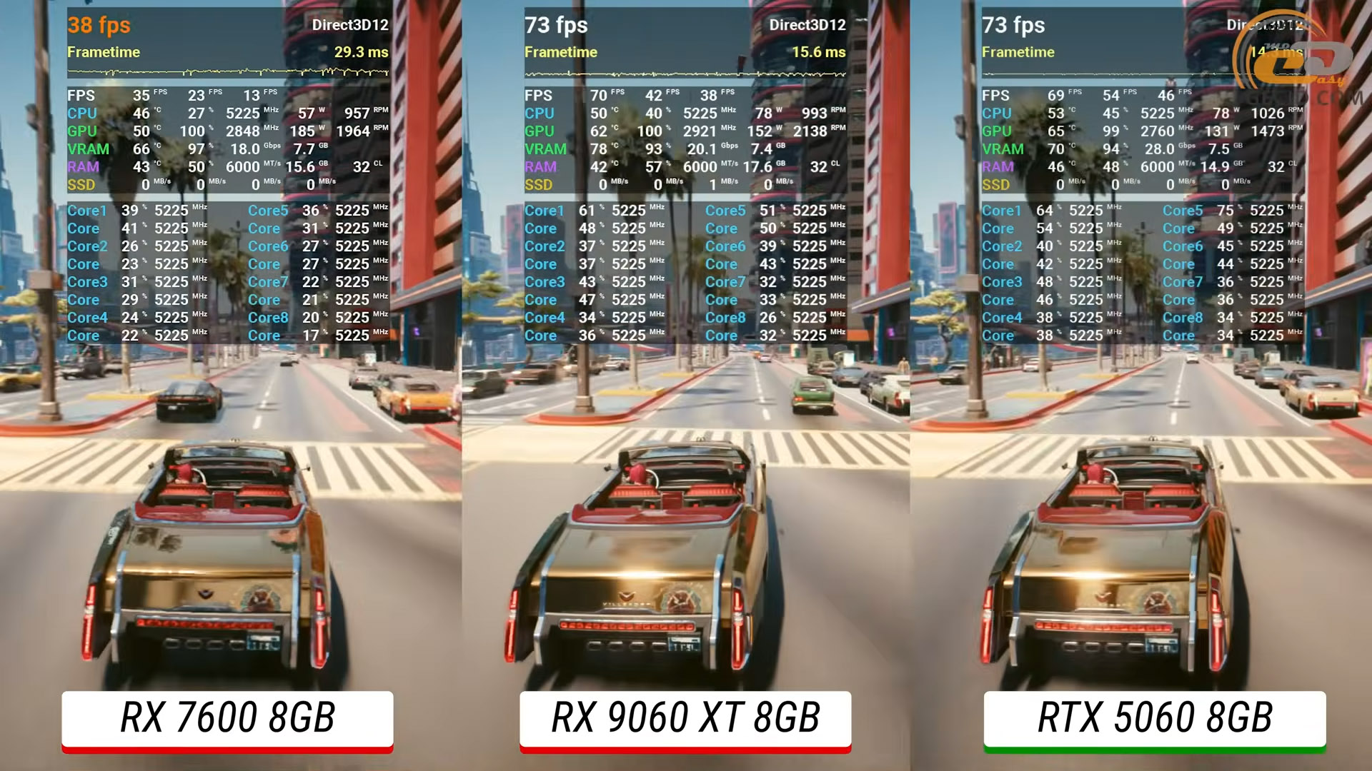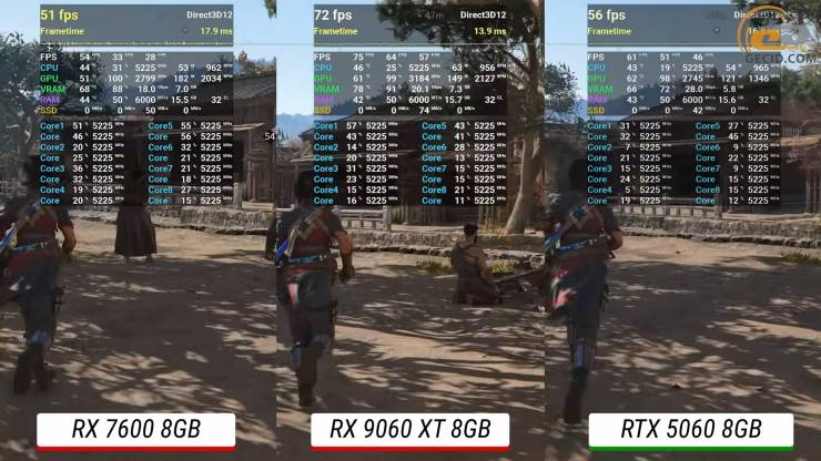 По сравнению с Arc B580, разница превышает 35 процентов. Самый же контраст снова фиксируется при сравнении с предшественницей RX 7600, которая отстает более чем в три раза, подтверждая разительный разрыв между поколениями в этой игре.