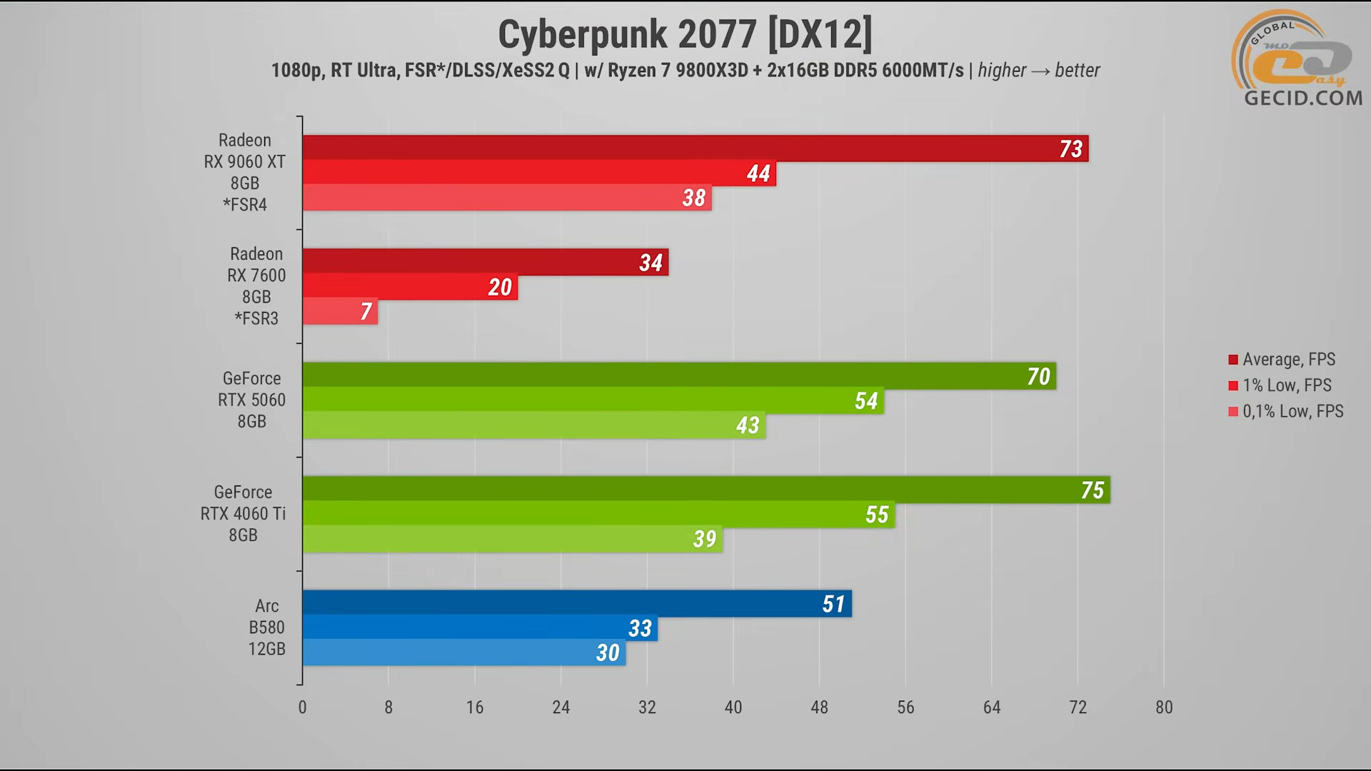 После активации методов интеллектуального масштабирования ситуация стабилизируется. Но теперь позиции снова перемешиваются, и первое место занимает RTX 4060 Ti с результатом 75 средних кадров в секунду, тогда как RX 9060 XT и RTX 5060 занимают второе и третье место с отставанием в 3 и 5 кадров соответственно.