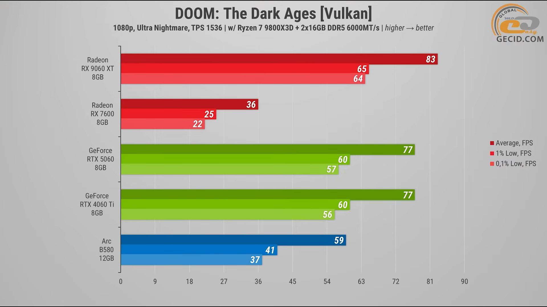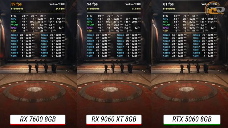 В тяжелом DOOM: The Dark Ages на «Ультра Кошмарных» настройках неожиданно именно Radeon RX 9060 XT показывает себя максимально уверенно: она даже обходит RTX 5060 и RTX 4060 Ti примерно на 8 процентов, под которые этот тайтл должен быть лучше оптимизирован.