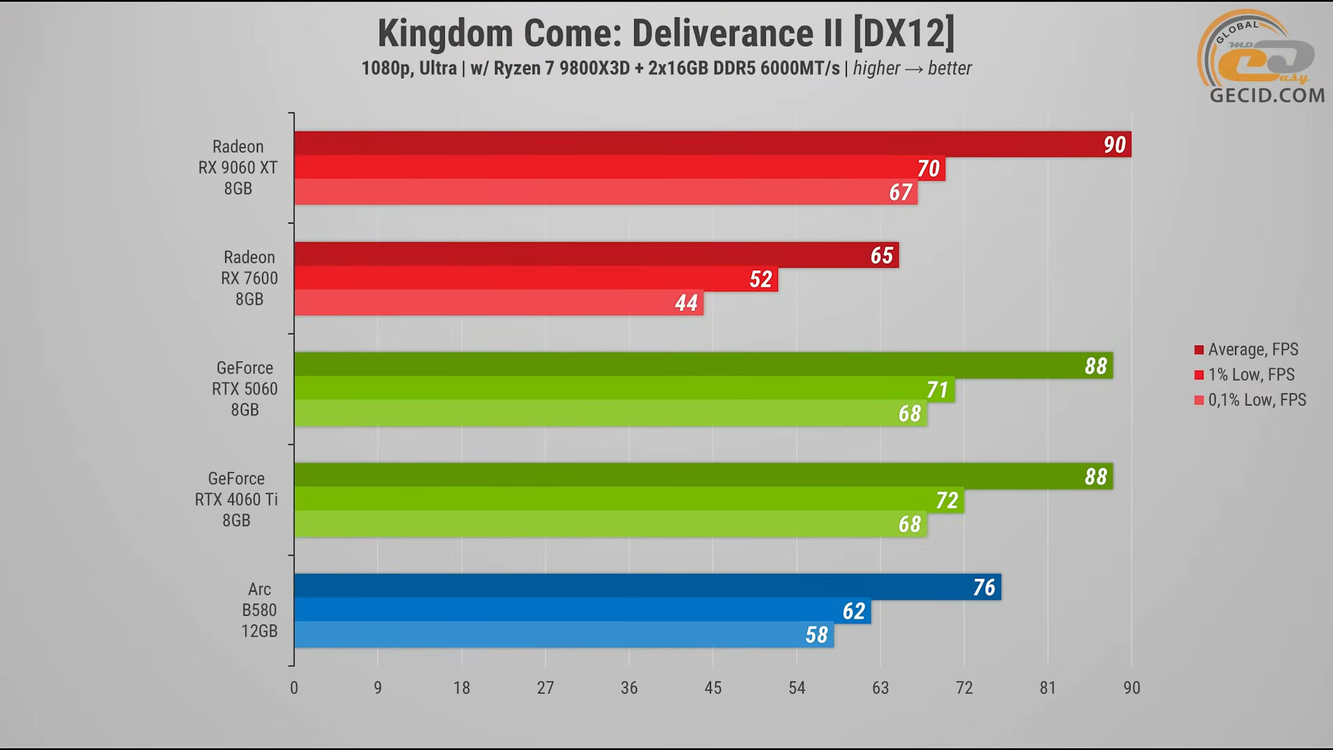 Однако по стабильности кадров 9060 XT выглядит чуть увереннее и чуть-чуть опережает лагерь «зеленых» по этому показателю. Arc B580 и RX 7600 оказываются позади, проигрывая испытуемой около 15-18 процентов, но их показатель FPS тоже остается на вполне удовлетворительном уровне.