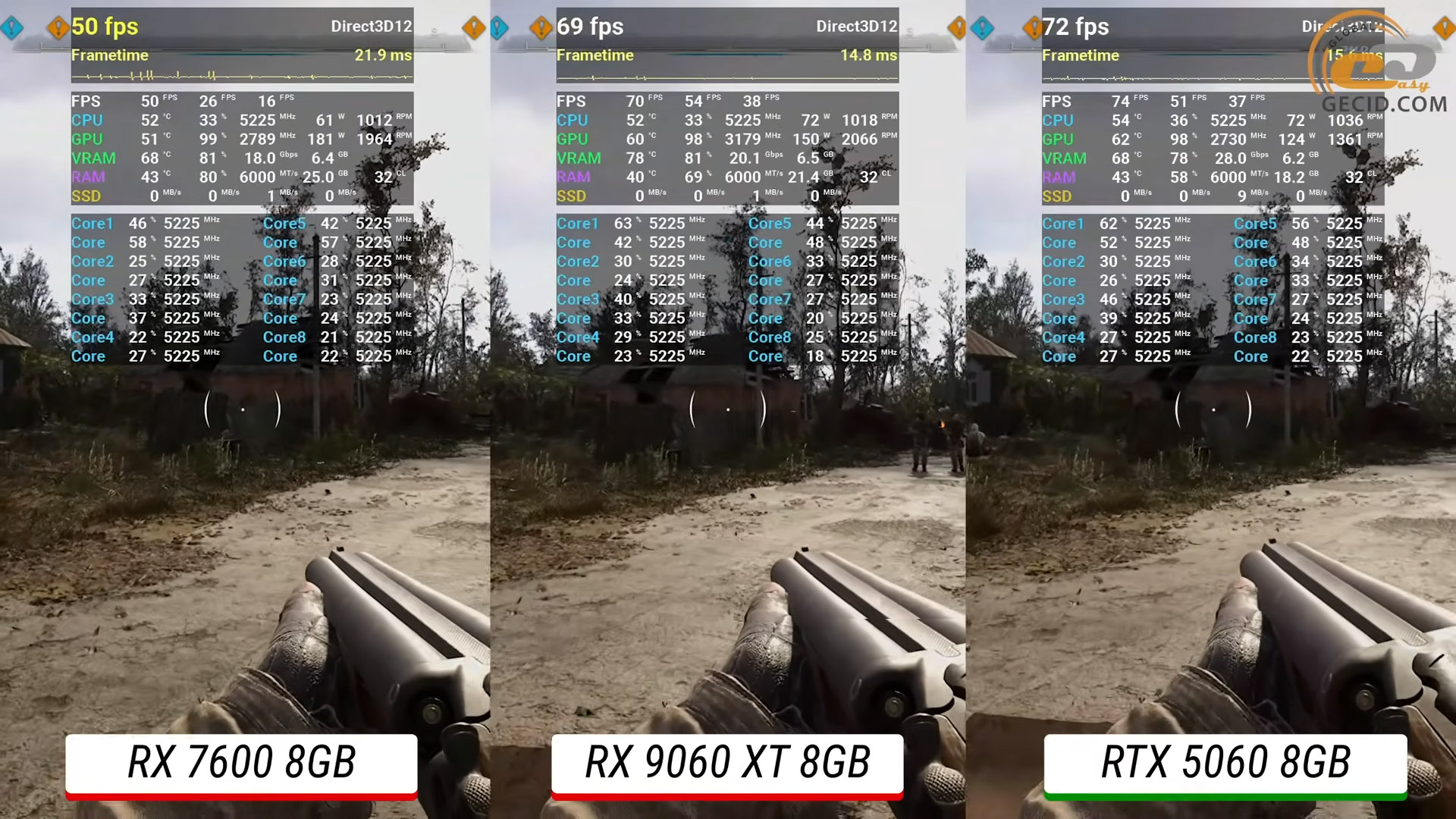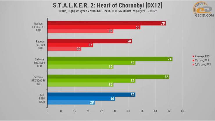 Напоследок в S.T.A.L.K.E.R. 2 с высокой графикой Radeon RX 9060 XT уже выдыхается и немного уступает своим главным конкурентам от NVIDIA. RTX 5060 оказалась впереди примерно на 5 процентов, с лучшими показателями как по среднему FPS, так и редким кадрам. RTX 4060 Ti также обходит 9060 XT – в пределах малозаметных 3 процентов.