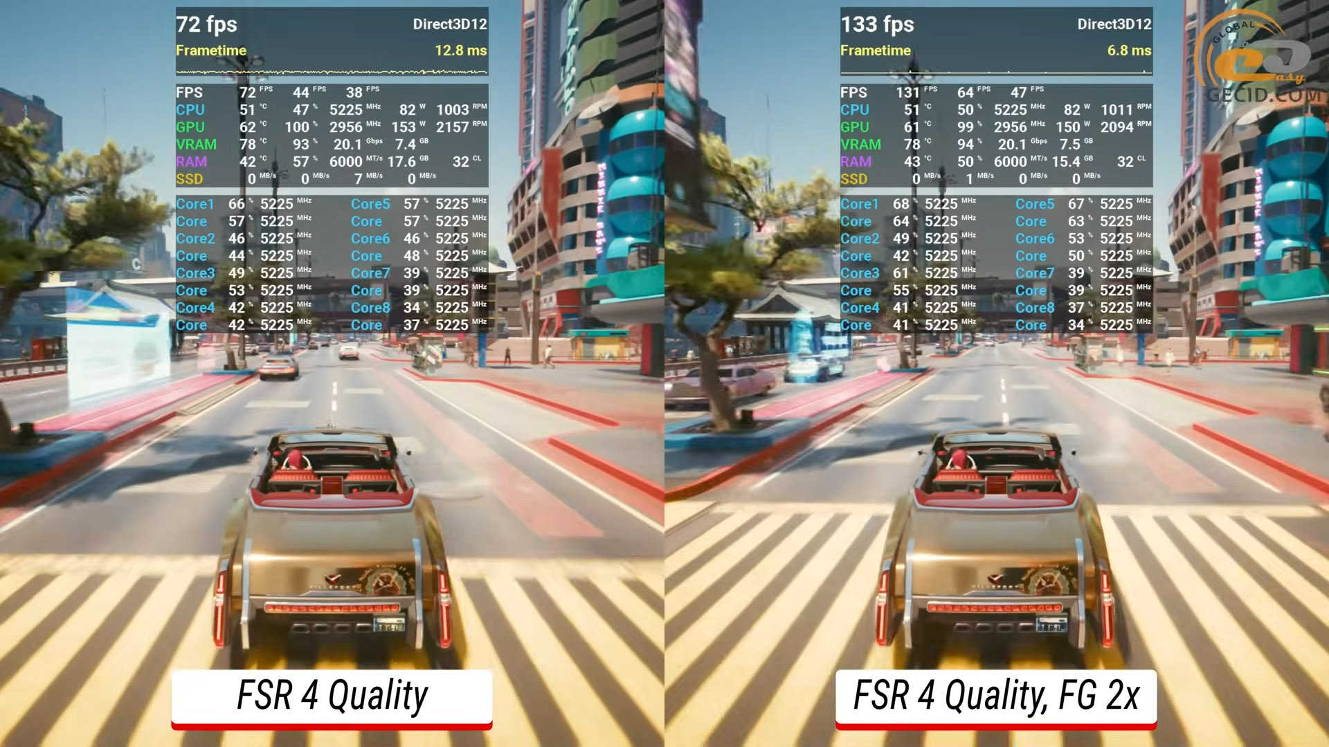 В Cyberpunk 2077 в режиме RT Ultra и FSR4 на качественном уровне базовая производительность на RX 9060 XT составляет около 73 кадра в секунду – этого достаточно для игры, но для высокогерцовых мониторов недостаточно. Как только активируется режим двухкратной генерации кадров, частота обновления возрастает до 133 FPS. Таким образом, прирост составляет более 80%, и именно здесь становится заметным преимущество новых технологий. Однако, стоит заметить, показатель очень редких событий не сильно улучшился — так что некоторые подергивания все равно возможны.
