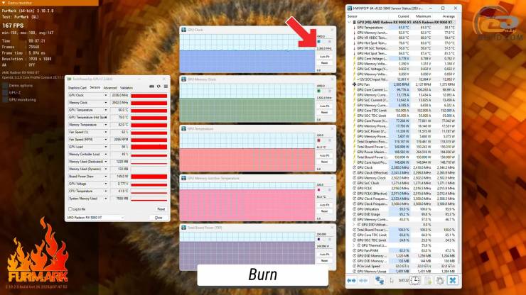 Во время нагрузки тяжелым бенчмарком Furmark графический процессор выкладывается на максимум и греется уже где-то на 60 градусов, а температура VRAM доходит до 82 градусов по Цельсию. Работает видеокарта в таком режиме на частоте примерно 2305 МГц, а энергопотребление упирается в свой максимум.