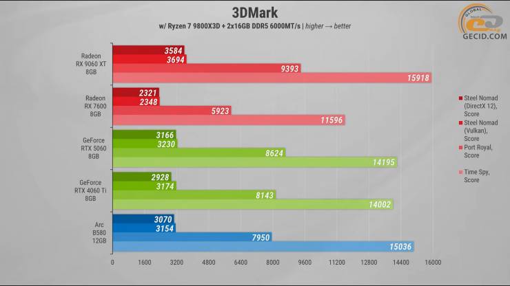Против RTX 4060 Ti и RTX 5060 ее позиции уже менее однозначны: в одних дисциплинах RX 9060 XT побеждает или идет вровень, тогда как в хорошо оптимизированном под оппонентом софте «зеленые» ускорители значительно сильнее. Intel Arc B580 в синтетических тестах держится относительно близко, что обычно сопоставимо с разницей в стоимости.