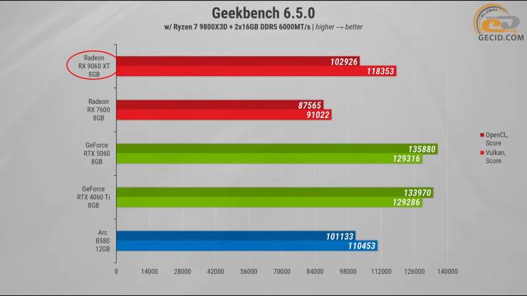 В Geekbench Radeon RX 9060 XT уже не выглядит столь убедительно. По сравнению с RTX 5060, она проигрывает в среднем примерно 16 процентов, но на этом плохие результаты не заканчиваются. RTX 4060 Ti в этом бенчмарке оказалась довольно быстрее. Ситуация с Arc B580 тоже интересная – здесь преимущество испытуемой составляет небольшие, но уверенные 4,5 процента. Единственный стабильный объект для издевательства – RX 7600, от которого новинка имеет комфортные 17,5 и 30 процентов отрыва в зависимости от режима тестирования.