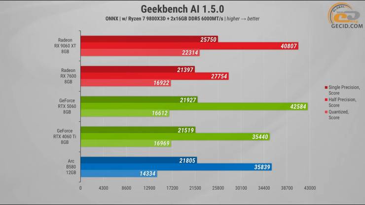 С алгоритмами нейросетей в Geekbench AI RX 9060 XT справилась с достаточно стабильным результатом. По сравнению с RX 7600 разница составляла примерно 33 процента в среднем, что вполне логично для разных поколений. Над RTX 5060 преимущество умеренное – около 15 процентов, причем все сильно зависит от точности вычислений, потому что в одном из испытаний представительница «зеленых» даже немного вышла в лидеры. Против RTX 4060 Ti новинка выступила более убедительно, опережая ее в среднем на 22 процента. А вот соперничество с Arc B580 получилось переменчивым: от 16 процентов преимущества до около 29-ти.