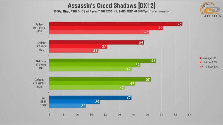 Начнём с Assassin's Creed Shadows на высоких настройках при выключенном глобальном освещении. В этом режиме Radeon RX 9060 XT уверенно опережает обоих своих главных соперников от NVIDIA и единственная предоставляет действительно достаточный запас кадров.