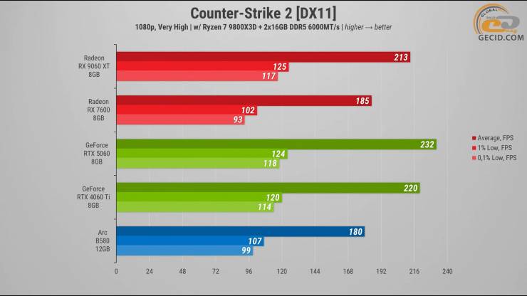 В бенчмарке Counter-Strike 2 ситуация для RX 9060 XT получилась нетипичной. В среднем она отстает от RTX 5060 примерно на 8 процентов, ведь видеокарты NVIDIA почти всегда лучше чувствуют себя в этой игре. RTX 4060 Ti также оказывается впереди, но разница уже не такая большая – буквально 7 FPS преимущества, то есть незначительные 4%.