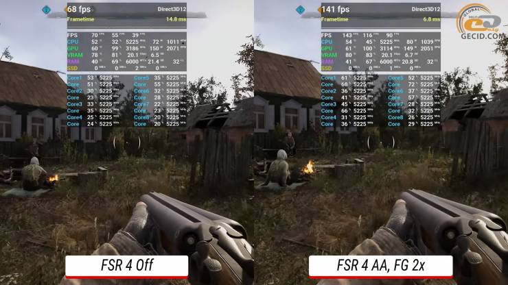 Подобная ситуация наблюдается и во втором «Сталкере». В почти нативном рендеринге на высоком пресете видеокарта выдает около 70 FPS в среднем и иногда заметны подергиваниями в привычных местах. Однако после включения FSR4 в режиме дополнительного сглаживания вместе с двухкратной генерацией кадров производительность возрастает до 143 FPS, а проседания уже почти не ощущаются.