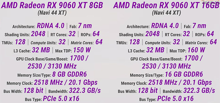 В основе обеих модификаций используется графический процессор Navi 44 в младшей конфигурации: 32 вычислительных блока, 2048 потоковых процессоров, 128 текстурных модулей, 64 блока растеризации, 32 RT-ядер и 64 AI-акселератора, а также 32 МБ. Рабочие частоты от базовых 1700 МГц до приличных 3130 в бусте. А заявленный TDP ограничен на уровне 150 Вт для младшей, тогда как у версии на 16 ГБ на 10 Вт больше.