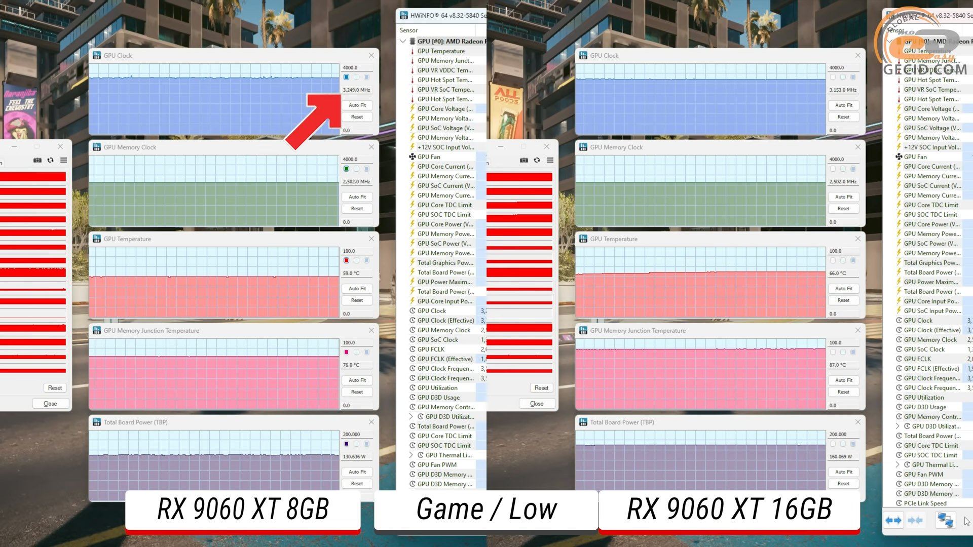 Лишь когда речь идет о тестировании игрового сценария при минимальных настройках 8-гигабайтная версия поражает своими рабочими частотами и будет буститься вплоть до 3250 МГц. Что касается второй испытуемой, то она лишь немного превышает паспортные значения.