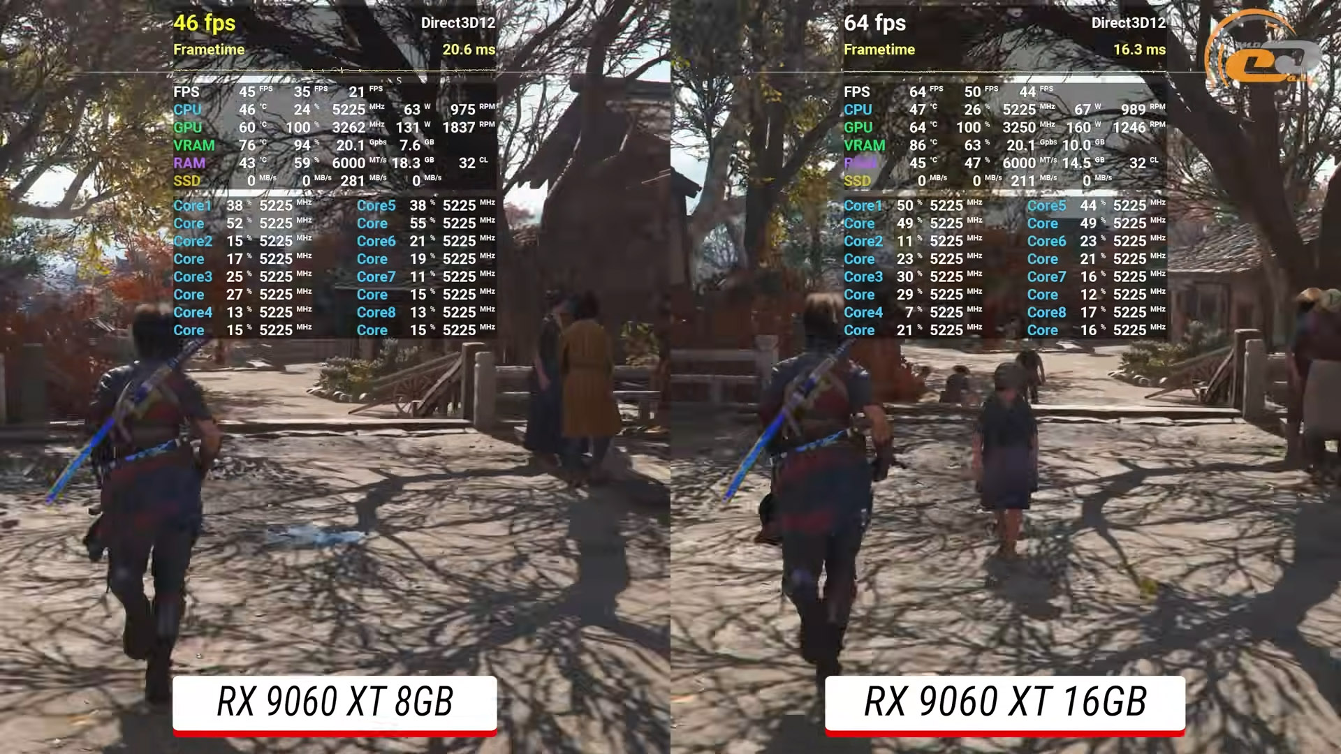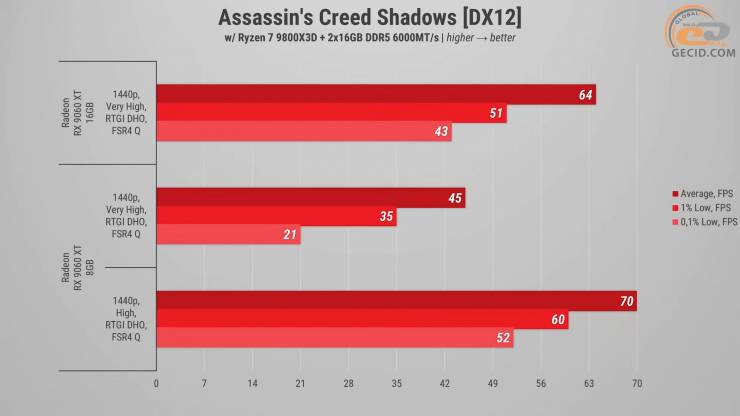 Начнем тестирование с пробежки осенним Киото в Assassins Creed Shadows на очень высоких настройках с вмешательством качественного FSR4, но без трассировки лучей. На старшей версии Radeon RX 9060 XT с 16 ГБ все выглядит довольно уверенно: средние 64 FPS, что обеспечивает плавный геймплей без ощутимых подергиваний. Всего видеобуфер заполняется до отметки в 10 ГБ. Так что совсем другая ситуация прослеживается на 8-гигабайтной модификации. Из-за ограниченного объема видеопамяти игра агрессивно занимается дополнительным менеджментом ресурсов, что сразу сказывается на стабильности — имеем только 45 FPS в среднем, а показатель очень редких событий указывает на значение вдвое меньшие от средних. Именно поэтому встречаются периодические микрофризы во время быстрых перемещений — очевидное следствие недостатка VRAM в проектах с большими открытыми локациями.