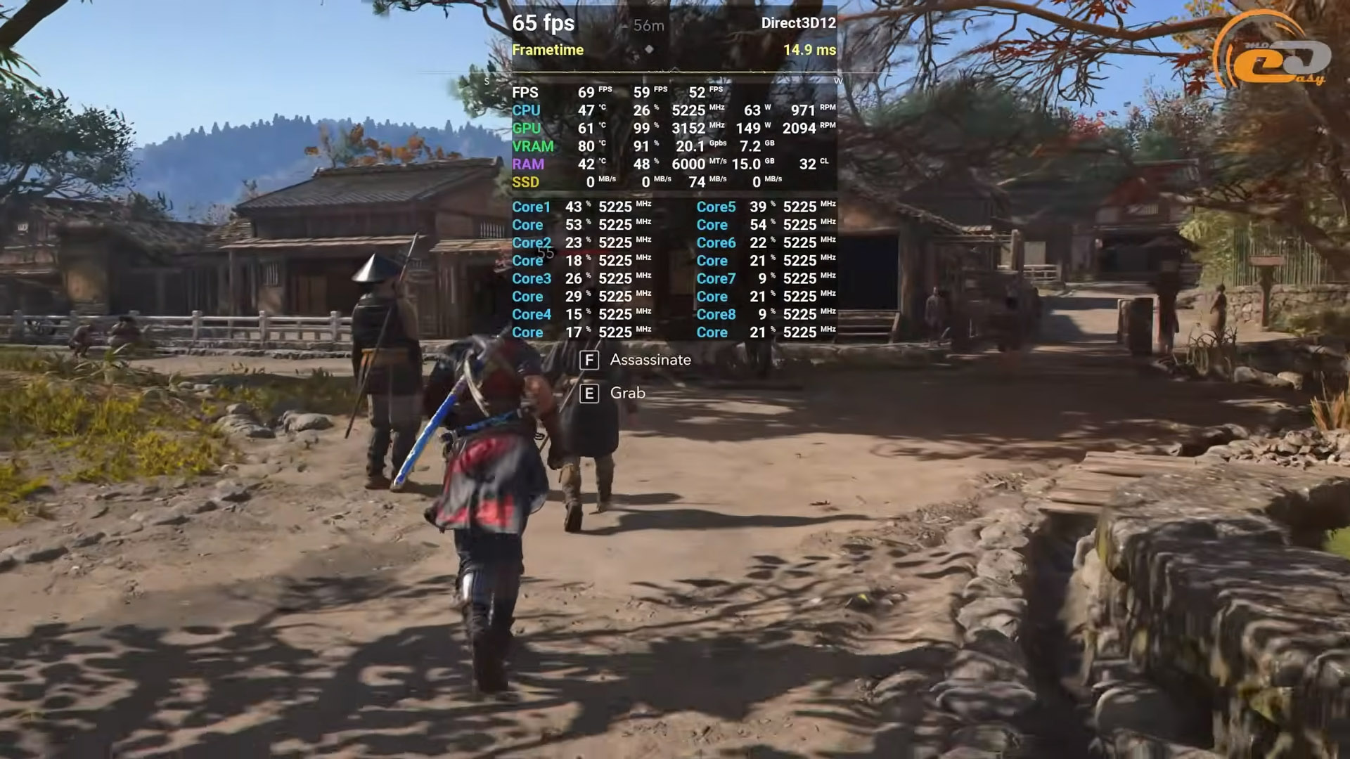 Также мы проверили производительность и при полной трассировке лучей. В этом режиме нагрузка на систему заметно выше из-за активного глобального освещения и тени, поэтому интеллектуальное масштабирование пришлось перевести в производительный режим. С такими настройками старшая версия RX 9060 XT на 16 ГБ выдает стабильные 65 FPS, что позволяет комфортно передвигаться по открытым районам Киото без существенных просадок. А вот на 8-гигабайтной модификации ситуация более сложная, но еще довольно играбельная, однако периодически все же возникают рывки при резких поворотах камеры или быстрых перемещениях. Здесь игра уже упирается в видеопамять, из-за чего происходит более активная подгрузка ресурсов.