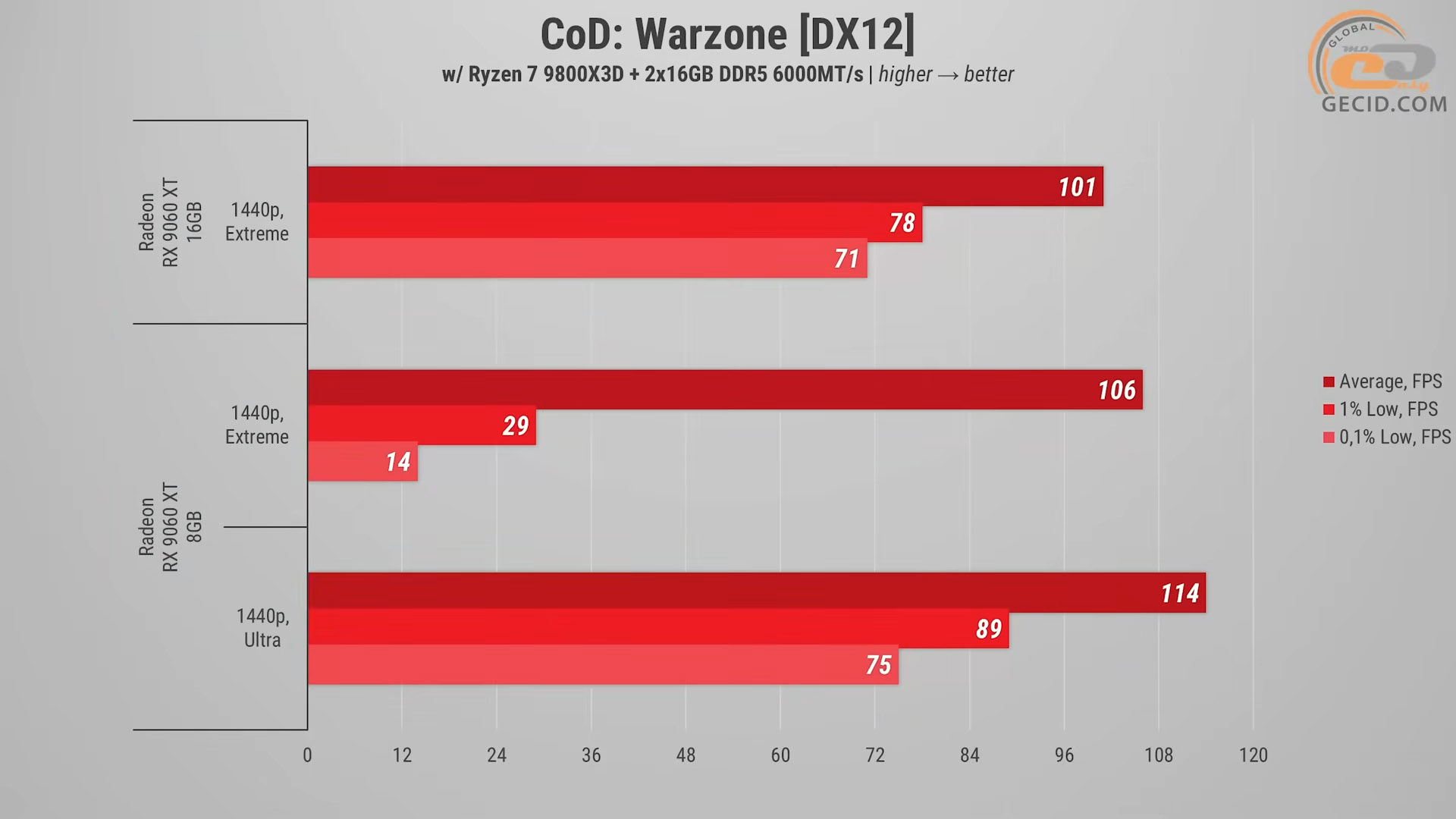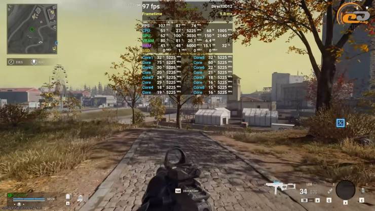 При экстремальных настройках Call of Duty: Warzone результаты оказались довольно интересными. В среднем 8-гигабайтная RX 9060 XT даже показывает несколько более высокие цифры – 106 FPS против 101-го у 16-гигабайтной модели. Но это тот случай, когда среднее значение не отражает реального качества геймплея. На младшей карте из-за нехватки видеопамяти появляются серьезные подфризы и рывки при стремительных поворотах камеры. Они ощутимы настолько, что комфортная игра на Extreme-прессете становится главным препятствием к топ-1.