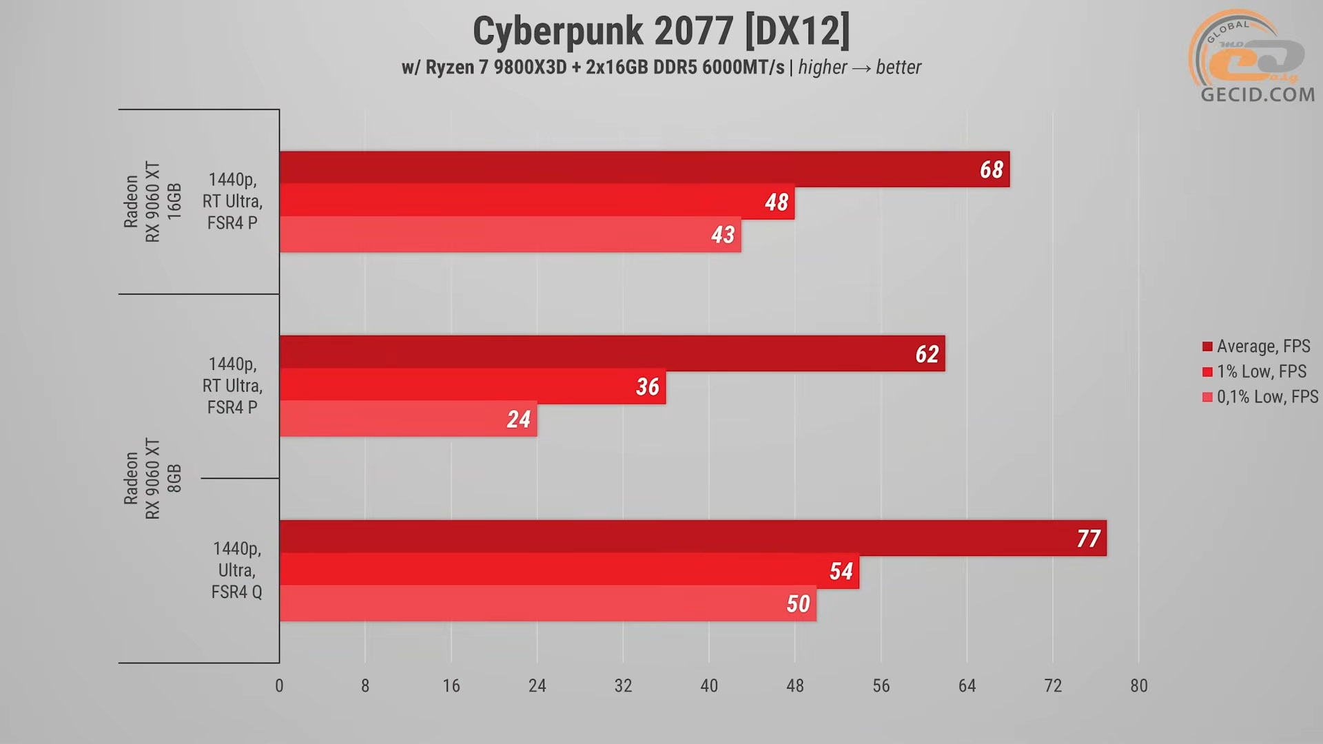 Полное выключение тяжелой трассировки лучей сразу дает значительно лучший результат в плане FPS. Так младшее исполнение RX 9060 XT обеспечивает около 77 средних кадров в секунду, а геймплей становится существенно более плавным — без характерных рывков, возникавших из-за предыдущей нехватки видеопамяти. При этом растет и четкость изображения благодаря возможности перехода на более качественный режим FSR4.