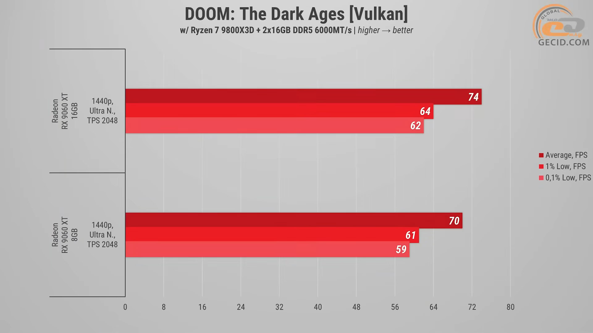 DOOM: The Dark Ages традиционно хорошо бегается, если не пробовать заглянуть в мир трассировки пути и не выкручивать на максимум текстурный пул. С просто ультра кошмарным пресетом на обеих версиях RX 9060 XT видим достаточно приятные результаты. Модель с 16 ГБ выдает 74 FPS, а младшая 8-гигабайтная практически те же показатели. Разница минимальная, и в реальном геймплее ее сложно заметить.