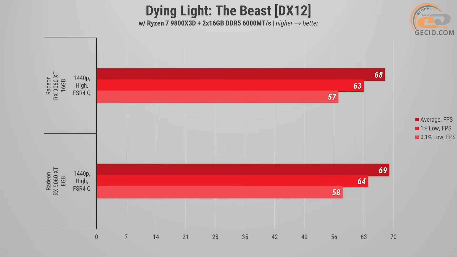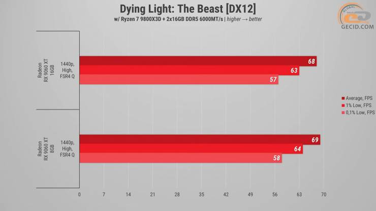 Dying Light: The Beast оказалась совершенно неприхотливой к объему видеопамяти – обе версии RX 9060 XT работают практически одинаково. В реальном геймплее разница не чувствуется: передвижение по загородным территориям и плотные сцены с инфицированными проходят без фризов или задержек — и показали почти идентичные, приближенные к 70 средним обновлениям экрана в секунду. Игра отлично масштабируется в пределах высокого пресета графики и не упирается в VRAM и на карте с восемью гигабайтами, а качественный режим масштабирования полностью позволяет забыть о неприятных просадках.