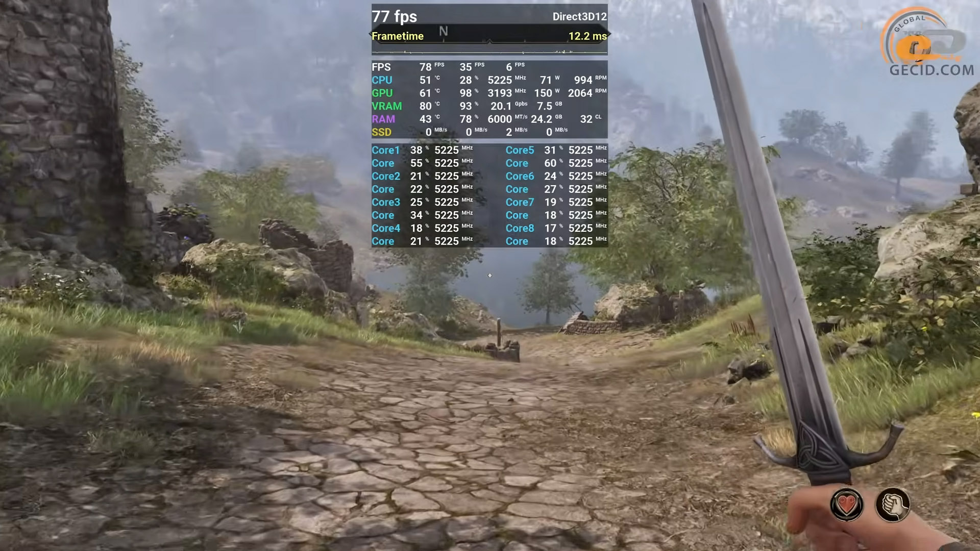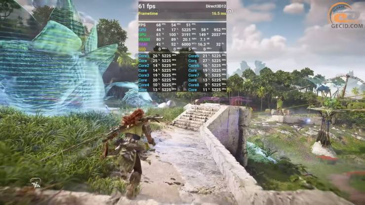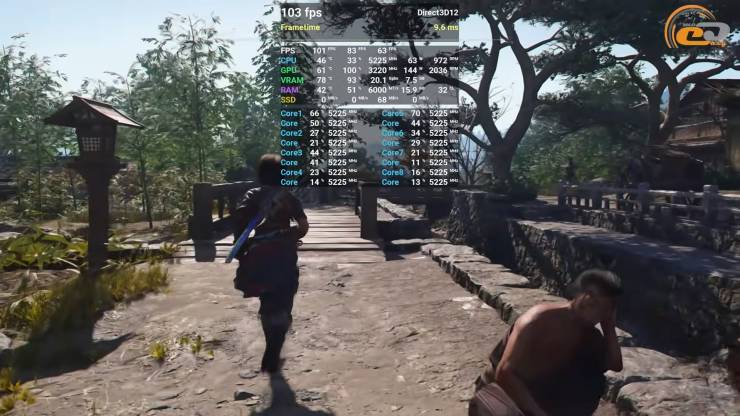 На 16 ГБ получаем 76 FPS, и игра работает плавно даже в густых зарослях или масштабных боевых сценах и при очень высоких настройках графики — запас VRAM позволяет движку развернуться, заняв 11 ГБ, а качественный FSR ускоряет частоту обновления экрана. На младшей версии есть в среднем 62 кадра в секунду, но стабильность страдает: в тяжелых моментах проседания могут быть ниже 50 обновлений, а подгрузка текстур иногда создает мелкие рывки. Для проекта такого уровня это ожидаемо – видеобуфер заполняется полностью – поэтому или вероятно доведется снижать качество настроек.