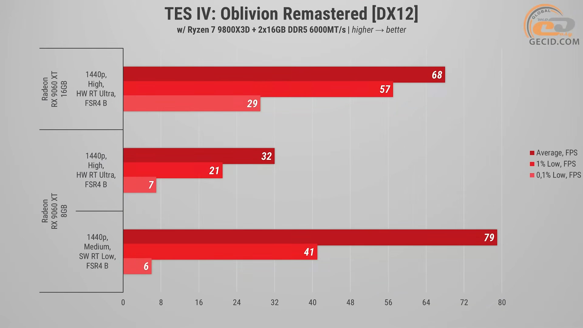 Ремастер четвертой The Elder Scrolls:Oblivion в текущем состоянии достаточно требователен к ресурсам и даже на старшей RX 9060 XT с 16 ГБ на высоких настройках в сочетании с ультра лучами выдает только 68 FPS. И это с помощью сбалансированного апскейлера, порой демонстрируя подергивания при прохождении больших локаций. Здесь мы наглядно видим, когда тяжелая трассировка лучей и массивные эффекты освещения существенно нагружают движок. На 8-гигабайтной версии игра с такими настройками работает откровенно плохо – 32 FPS. К этому добавляются рывки, подфризы и периодические недозагрузки элементов сцены из-за критической нехватки объема видеопамяти. В таком режиме играть практически невозможно, поэтому снижать качество придется обязательно.