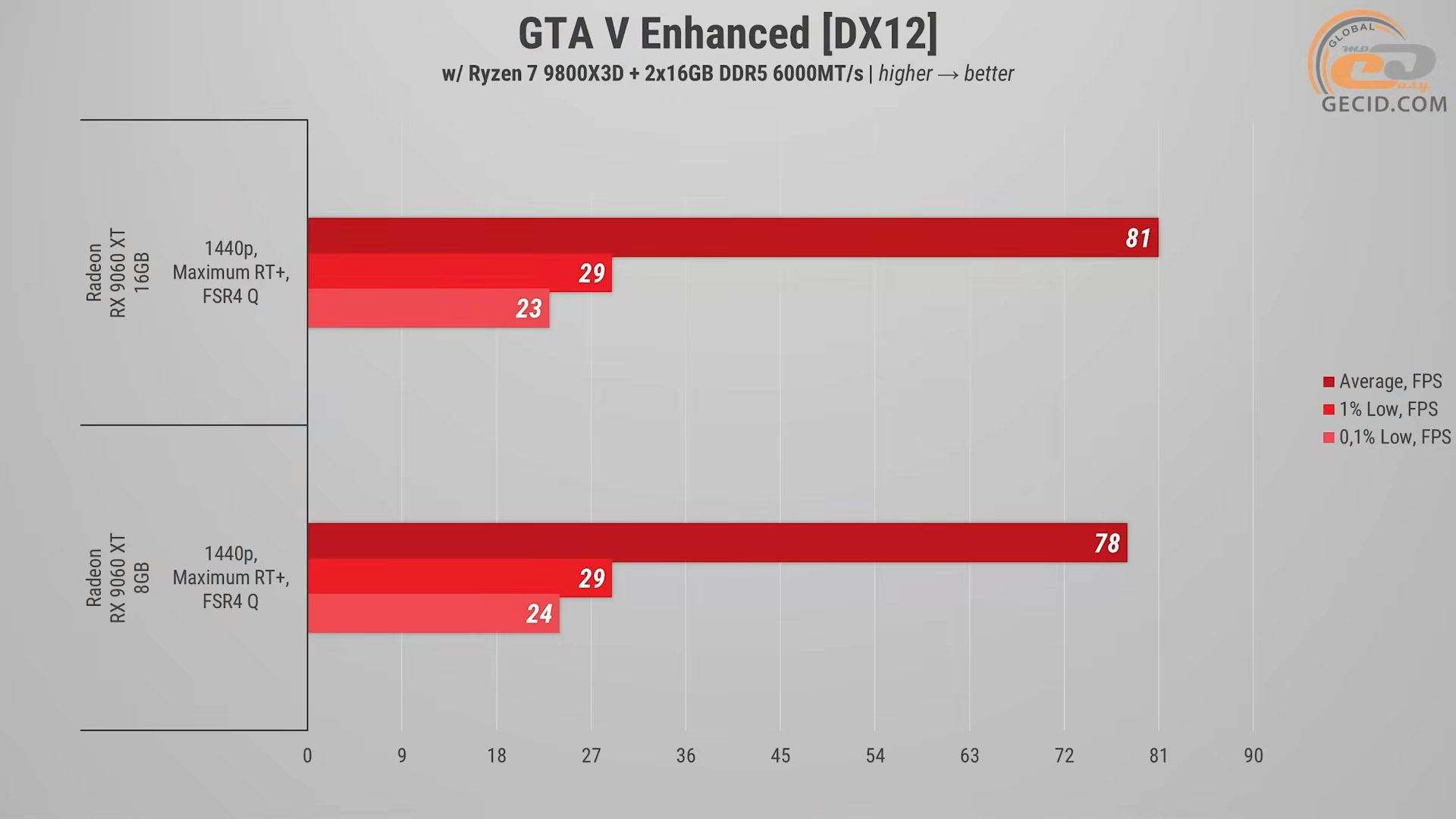 Улучшенная версия GTA V с максимальным RT-прессетом иногда тяжело работает на Radeon, и это сразу ощущается за стабильностью частоты кадров. На 16-гигабайтной версии RX 9060 XT игра выдает 81 FPS, если активировать качественный FSR4, но даже здесь иногда заметны рывки во время активного драйвинга по улицам Лос-Сантоса.