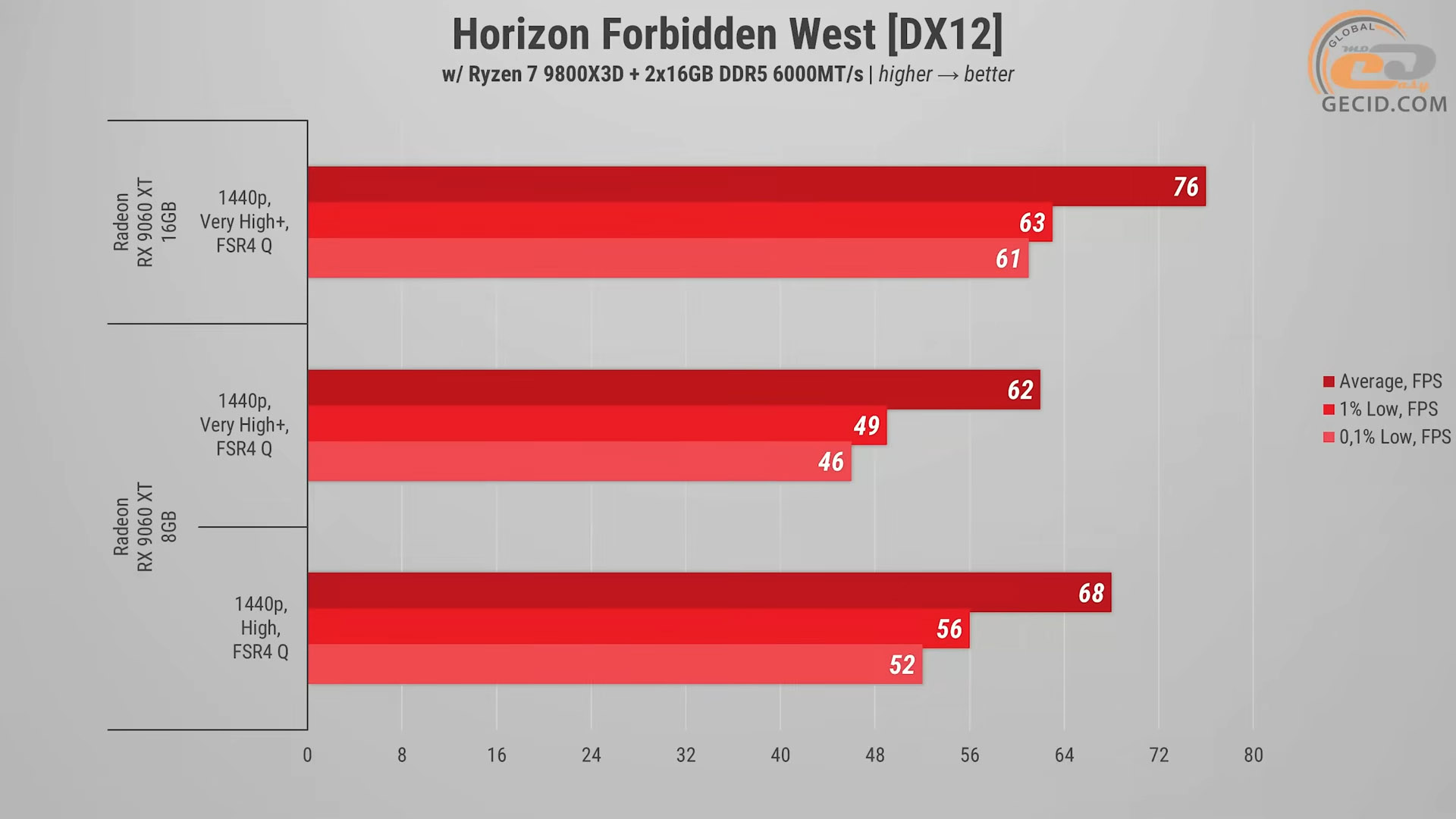 Horizon Forbidden West традиционно требовательная к объему памяти и графическим ресурсам благодаря очень проработанной атмосфере вокруг, поэтому разница между версиями RX 9060 XT здесь вновь становится ощутимой.