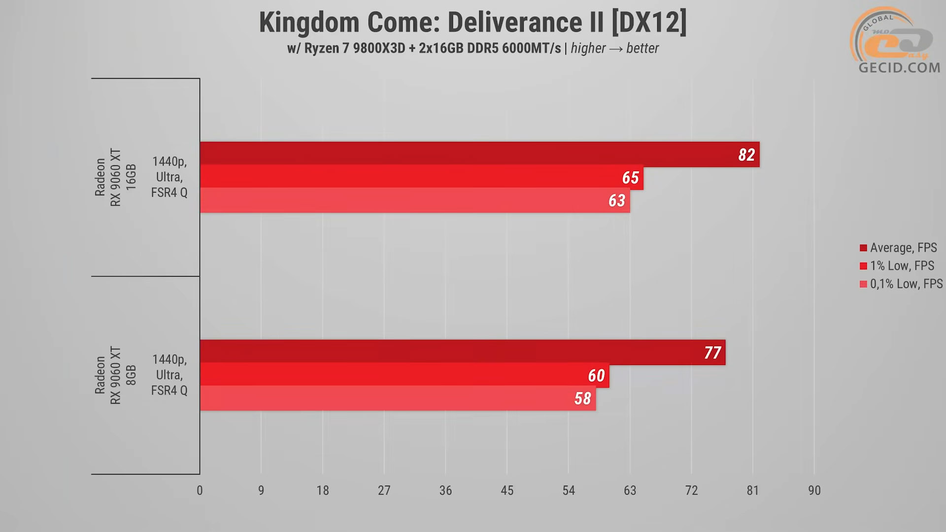 В Kingdom Come: Deliverance Ii на ультра настройках с FSR в режиме Quality обе версии Radeon RX 9060 XT показывают очень близкие результаты. Старшая модель с 16 ГБ выдает 82 FPS, обеспечивая плавную картинку, а младшая видеокарта держится недалеко сзади со средним результатом в 77 FPS, и в большинстве случаев геймплей остается столь же комфортным. Однако в локациях с плотной растительностью, где многие тени и подробные текстуры активнее нагружают видеобуфер, фреймрейт проседает заметнее, иногда ниже 60 кадров в секунду. При необходимости можно перейти на более агрессивные режимы апскейлинга или опуститься до просто высоких настроек – оба варианта значительно повысят стабильность на 8-гигабайтной версии без потери визуала.