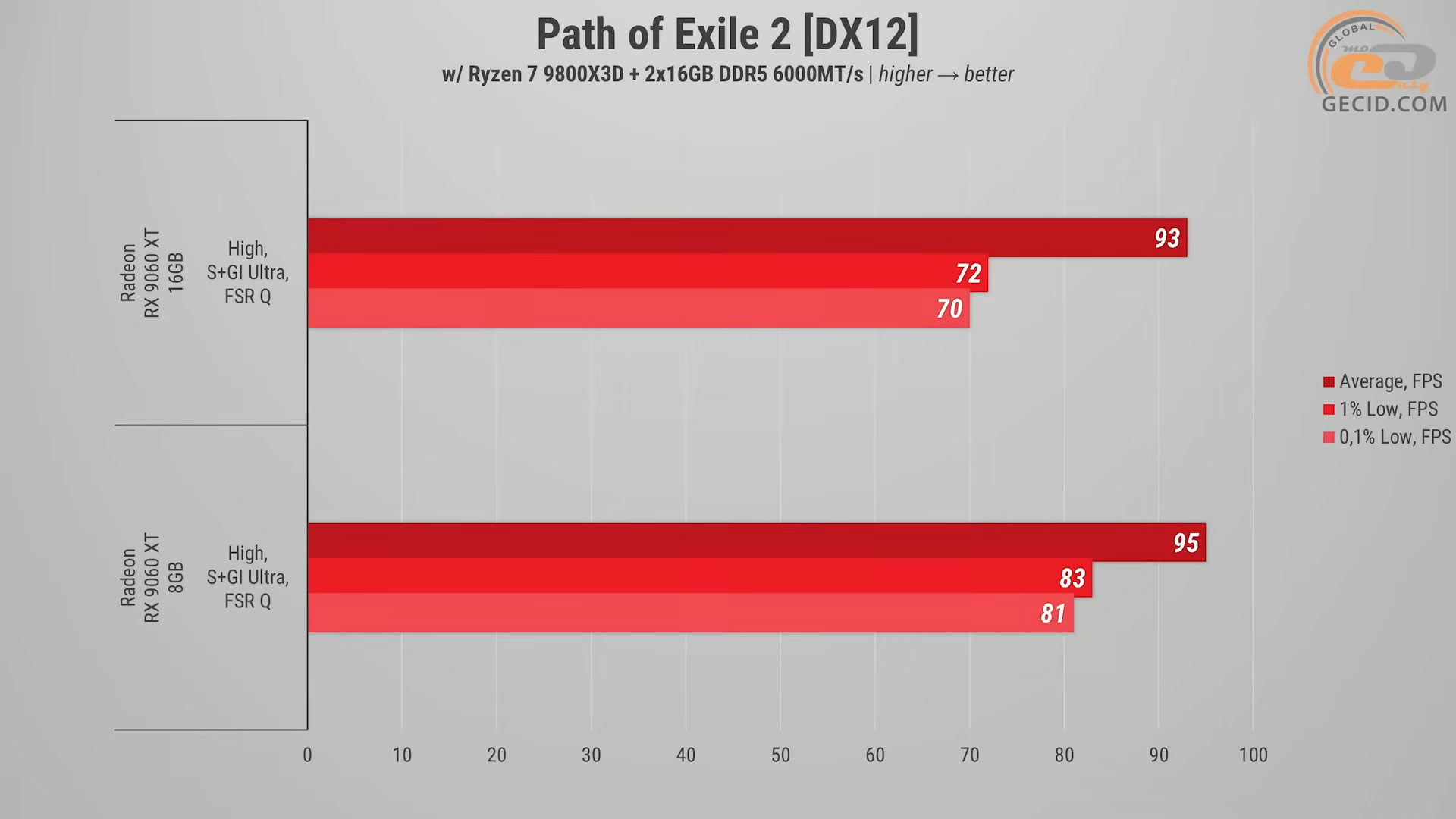 На высоких настройках с улучшенным глобальным освещением Path of Exile 2 работает очень стабильно на обеих версиях RX 9060 XT, а качественный режим FSR помогает почти дотянуть до трехзначных показателей фреймрейта. Поскольку погрешность в этом тесте большая, так получилось, что молодая карта даже немного опередила старшую, хотя без мониторинга в самом геймплее было бы трудно заметить.