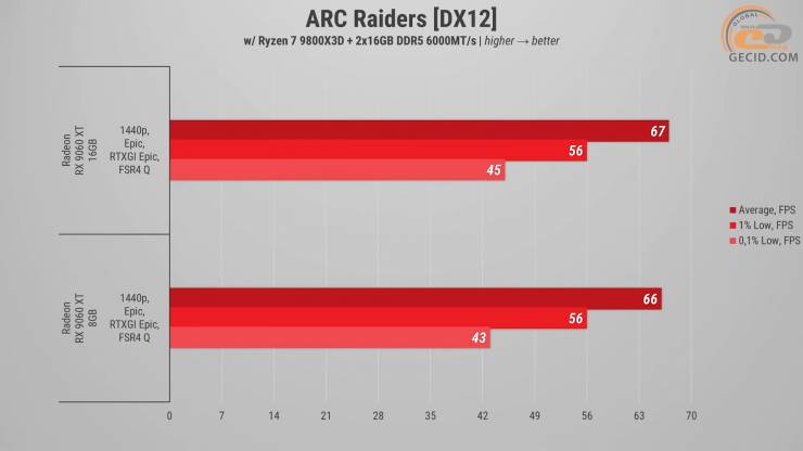 ARC Raiders оказалась довольно лояльной к объему видеопамяти, поэтому даже на максимальных настройках с улучшенным глобальным освещением обе версии Radeon RX 9060 XT показывают почти идентичные результаты. Старшая модификация с 16 ГБ выдает 67 FPS, тогда как 8-гигабайтная - 66 FPS, что обусловлено немножко разными рабочими частотами. Игра не слишком активно использует видеобуфер и требует всего 6 ГБ, поэтому никаких фризов или загруженных объектов среды на младшей версии не наблюдается. В обоих случаях получаем стабильный и предполагаемый геймплей.